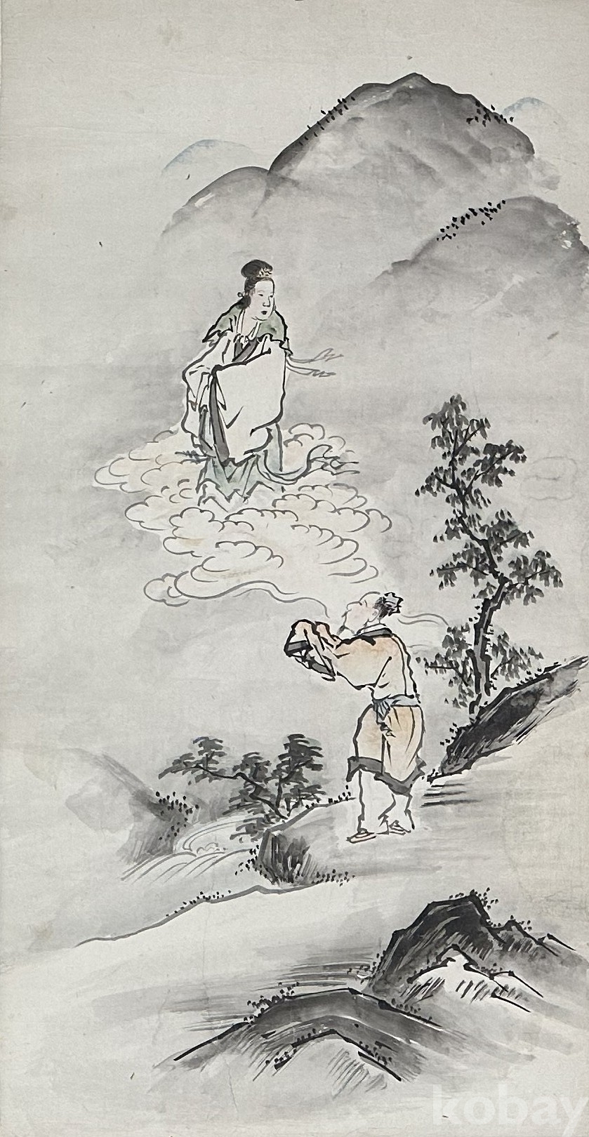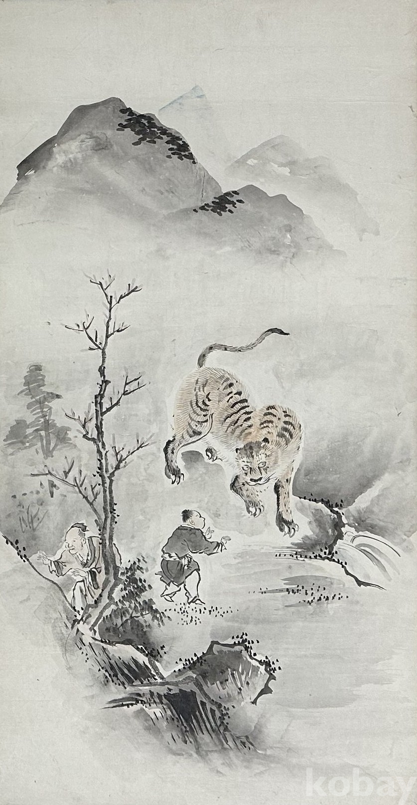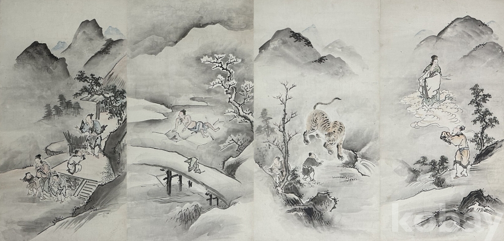 일본 전통 회화 양식을 바탕으로 제작된 수묵 풍속 및 설화 장면 구성의 연폭 작품이다. 산수 배경 속 인물 서사 장면과 호랑이 도상, 신선 표현이 연속적으로 배치되어 하나의 이야기 흐름을 형성하는 구성이 특징이며, 먹의 농담 표현과 여백 활용을 통해 깊이감 있는 화면 구성이 돋보인다. 종이에 직접 채색된 원화 형태로 연폭 특유의 구성미와 장식성이 살아 있으며, 동양화 컬렉션용 또는 공간 연출용 장식 작품으로 활용도가 높은 작품이다.
