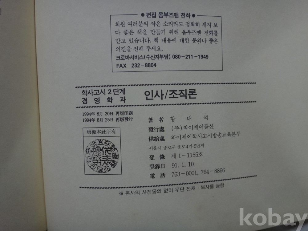 인사, 조직론 - 학사고시2단계, 경영학과 (1994년, 이정윤 저, 와이제이물산 발행)