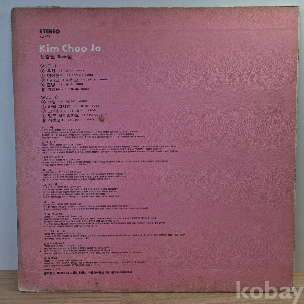 김추자 (후회 / 석양) 신중현 작곡집, 1973년 유니버샬레코드 초반, KLS-78