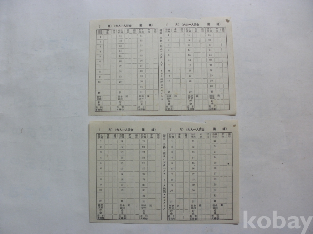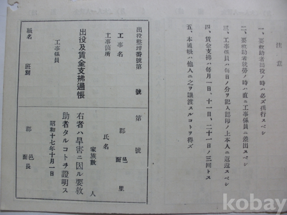 한해 (旱害) 구조자 증명 및 공사 출역 및 임금지불통장 - 2매일괄 (소화17년)