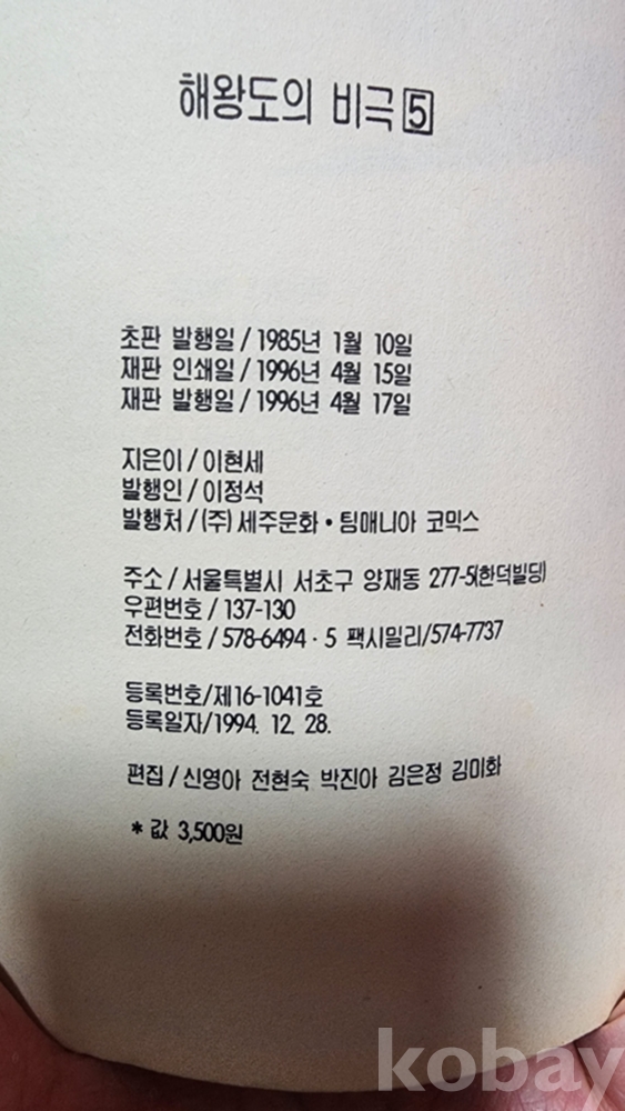 해왕도의 비극 1~5완결, 이현세 그림, 팀 매니아, 1996년