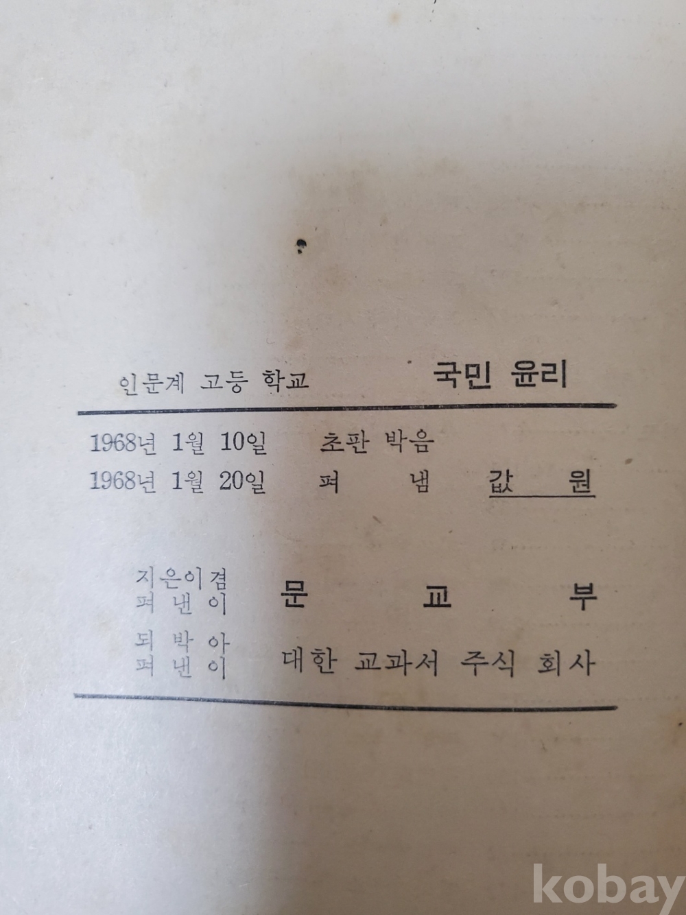 1. 국민윤리(인문계고등학교), 문교부, 대한교과서주식회사, 1968년, 259쪽, 상태 상, 사진 참조