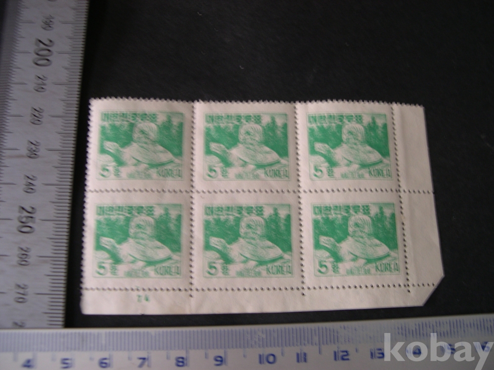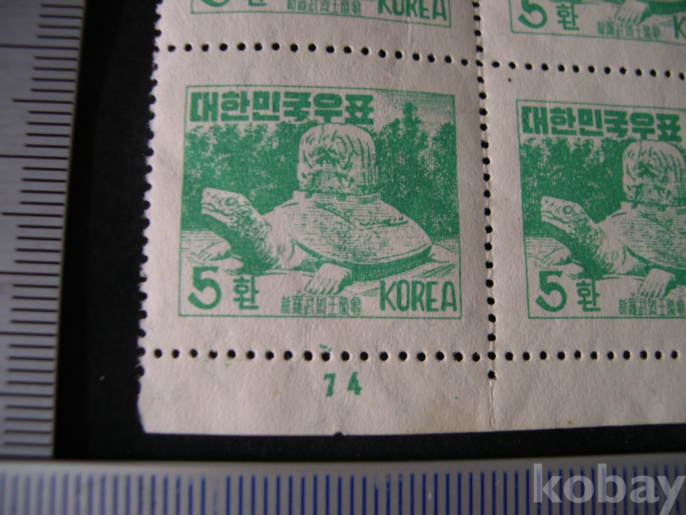 4코너 6매, 판번호 "74" #11220 : 5환 거북비 - 환화 1차 보통, 파형투문 (1953. 4. 5)