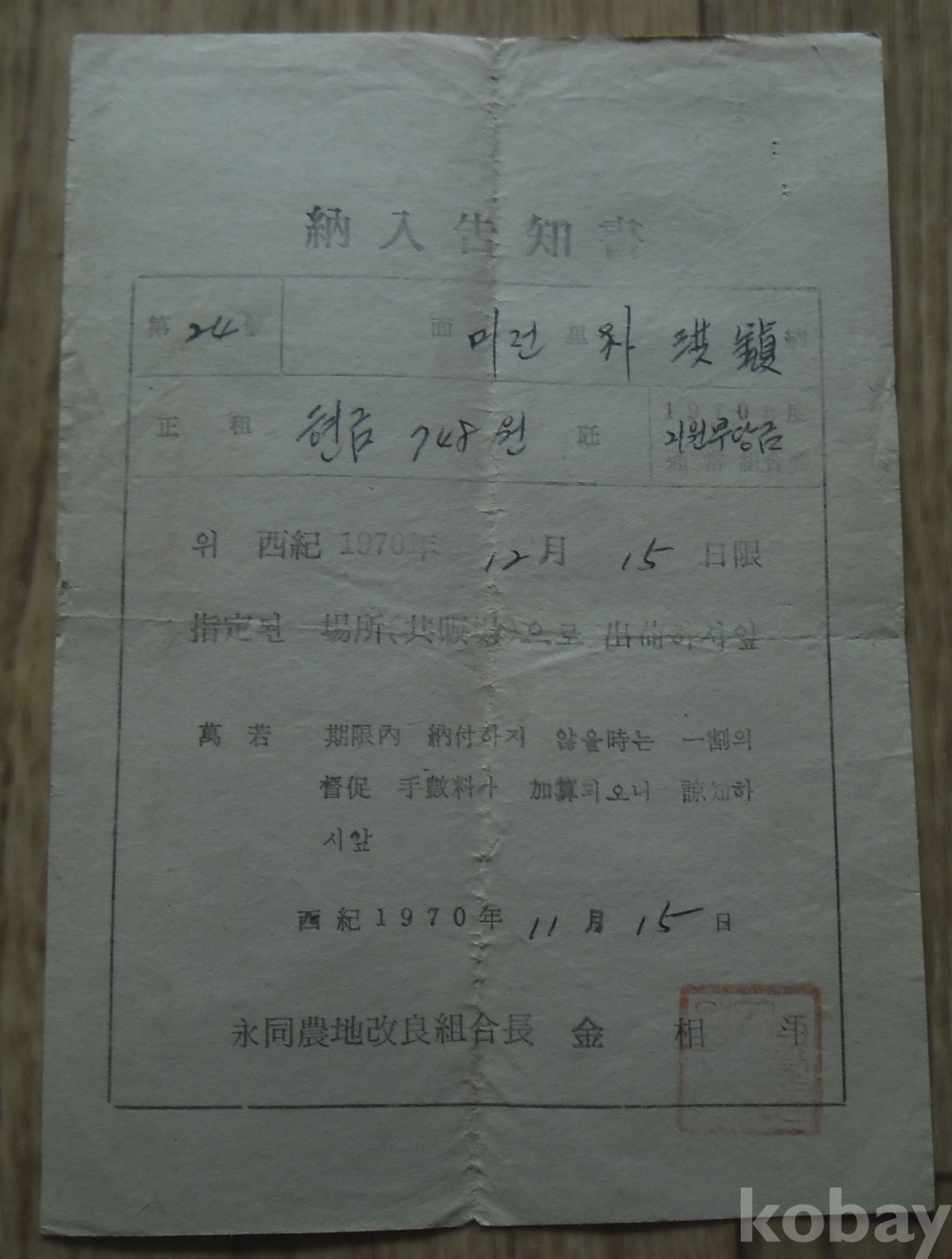 1970년 영동농지개량조합 지원부담금 납입고지서