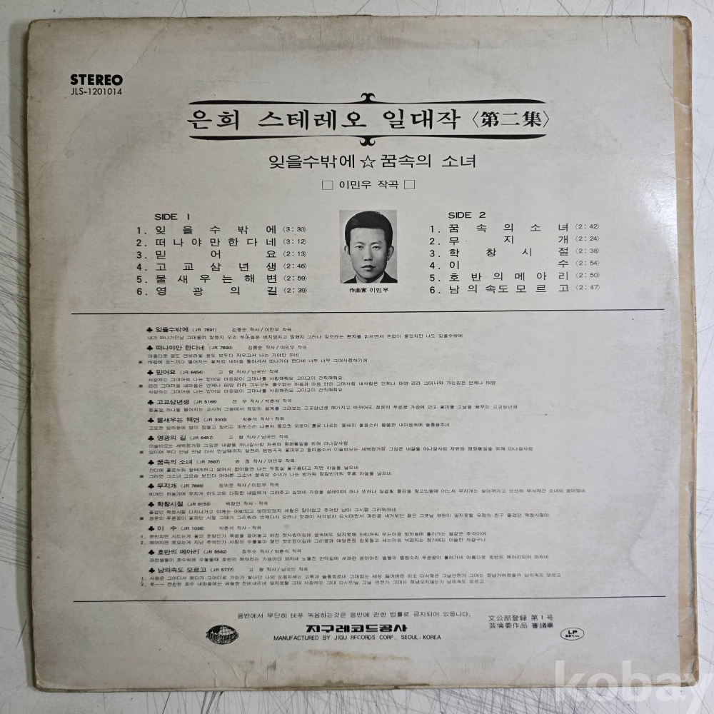 | 자켓상태 | VG : 주름, 접힘, 모서리 찢김 다수 | 음반상태 | VG : 생활 기스 다수, 가벼운 노이즈 존재 | 발매정보 | 초반 | 가사지여부 | 무 |
