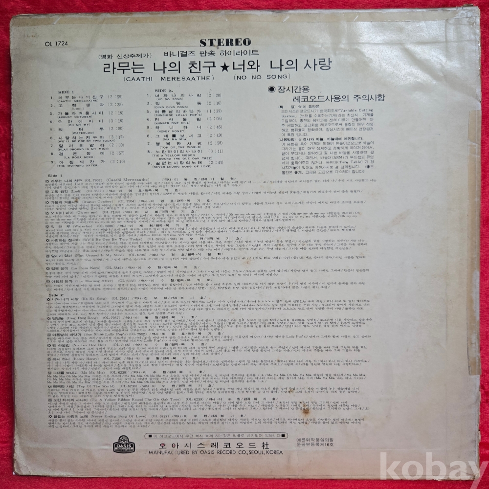 | 자켓상태 | VG : 주름, 접힘, 모서리 찢김 다수 | 음반상태 | EX : 재생에 영향 없는 가벼운 기스 존재 | 발매정보 | 초반 | 가사지여부 | 무 |