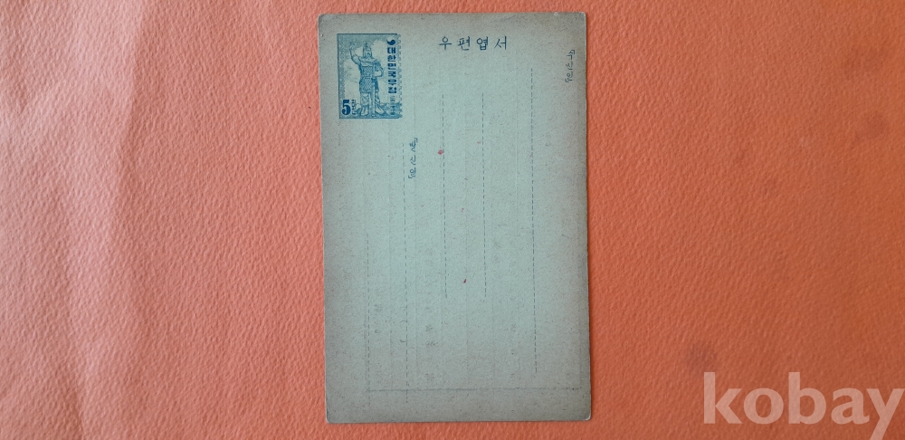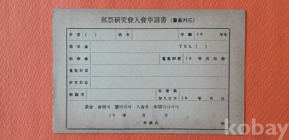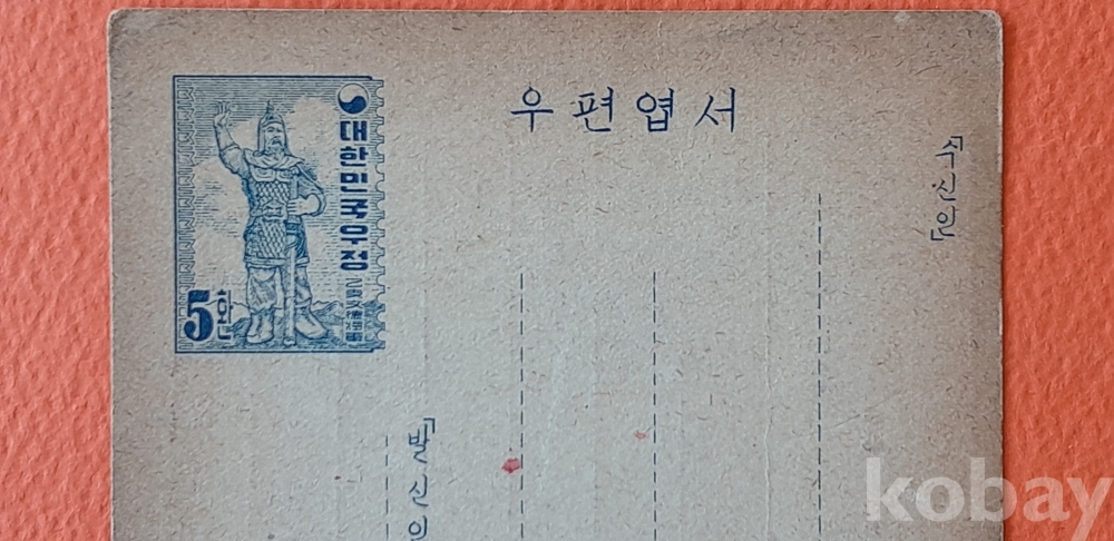 1954년 5환 을지문덕 엽서에 '우표연구회 입회 신청서'가 인쇄된 엽서 입니다.