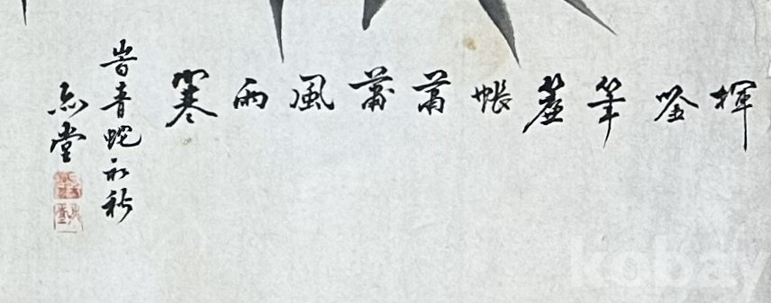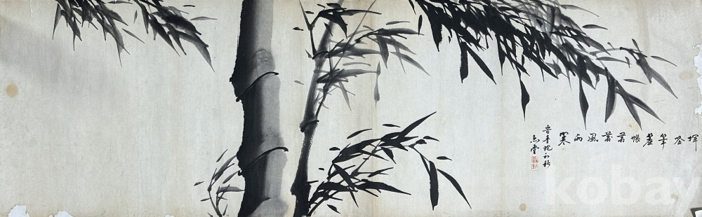 본 작품은 대형 가로형 화면 구성의 수묵 대나무 회화 작품으로, 굵은 죽간과 유연한 잎사귀 표현이 대비를 이루며 강한 필력과 리듬감이 돋보이는 작품이다. 먹의 농담 변화와 번짐 효과를 활용해 대나무 특유의 생동감과 공간감을 자연스럽게 표현하였으며, 우측 제발과 낙관이 배치되어 전통 문인화 형식을 따르고 있다. 화면 전반에 여백미가 강조되어 현대 인테리어 장식용으로도 활용도가 높다. 종이 재질 특성상 가장자리 부분에 자연스러운 세월 흔적과 색 변화가 일부 존재하나 전체적인 화면 구성과 필선 상태는 안정적인 편이다.