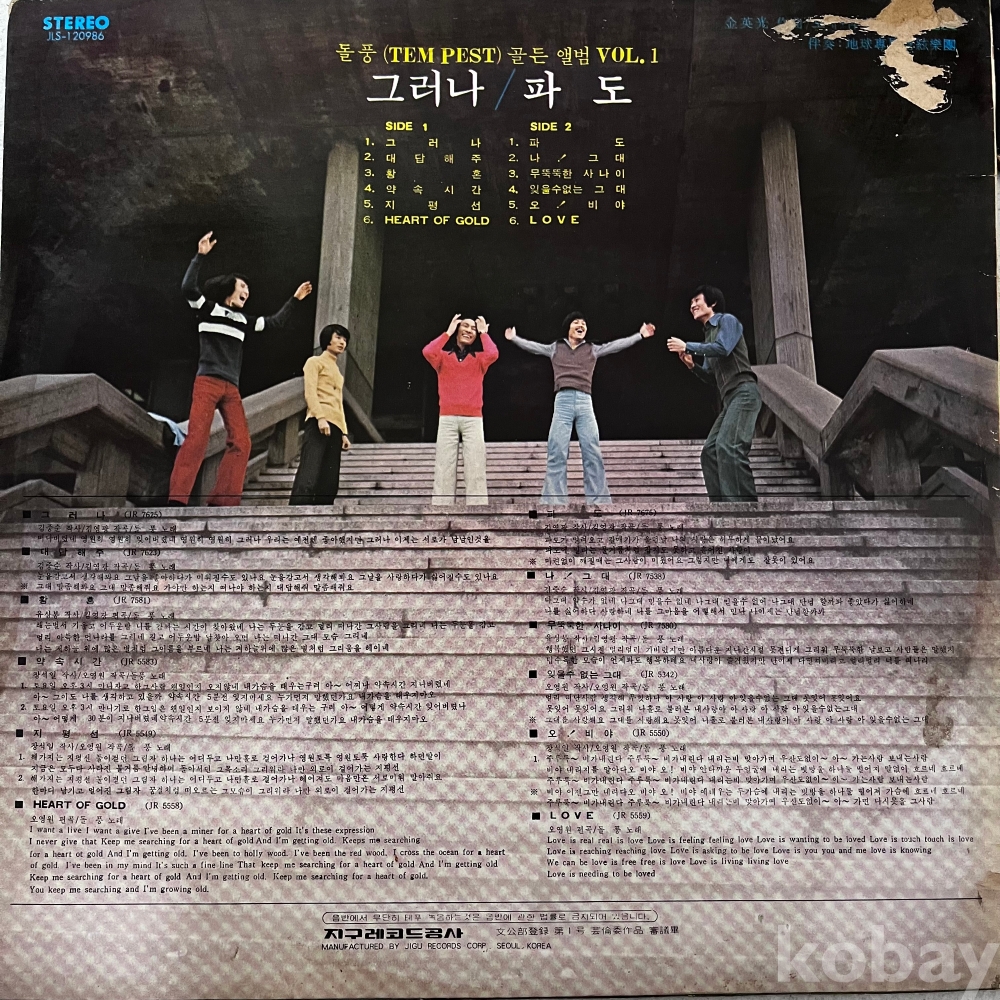 • 설명: 70년대 그룹사운드의 전설 템페스트의 귀한 음반입니다. 수집가분들이 선호하는 비매품 초반이며, '파도'와 '그러나' 등 주옥같은 명곡들이 수록되어 있습니다.