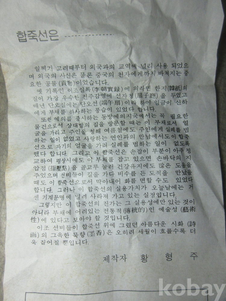 부채는 합죽선명인 황형주 선생님의 합죽선입니다.