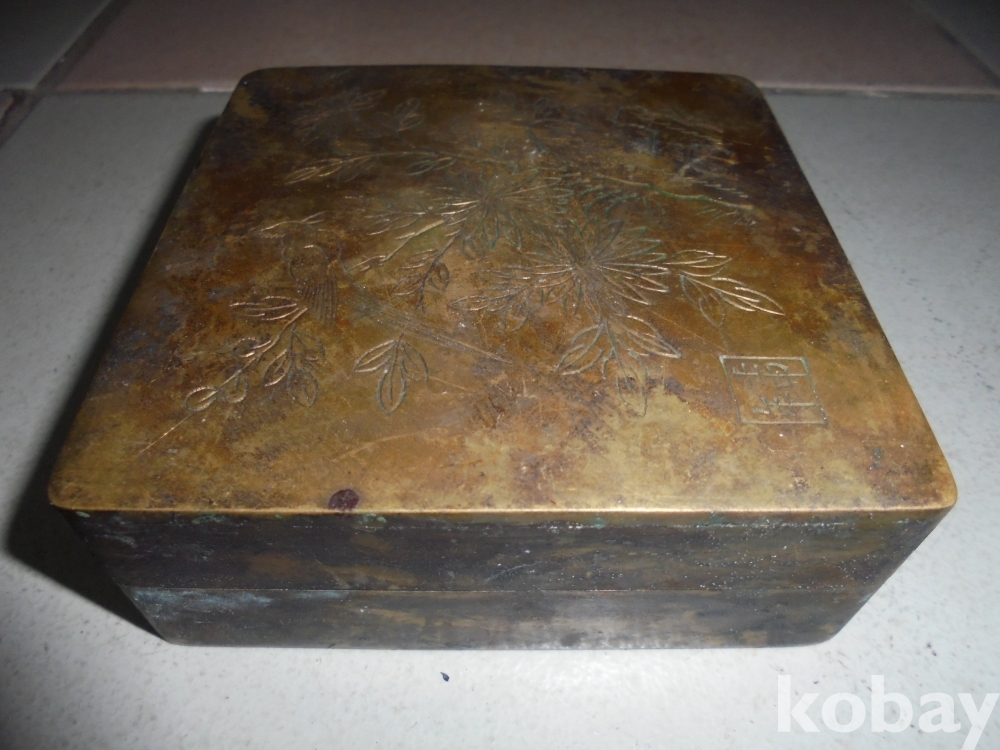 오래된 휴대용 먹물사각통으로 위에 괴석과 화조도 그려져있고 안에 먹물보호되는 솜이들어있고 두터운유기로 만들어 무거운 오래된 휴대용