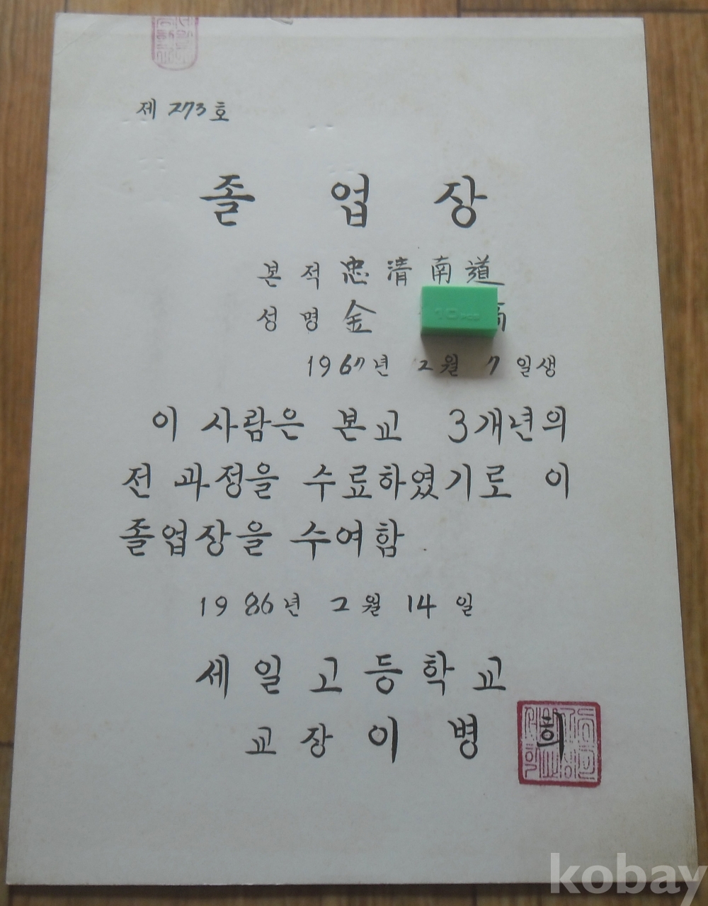 1986년 세일고등학교 졸업장