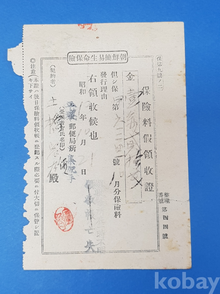 **** 1938년 조선간이생명보험 보험료영수증(평양우편국 불입)