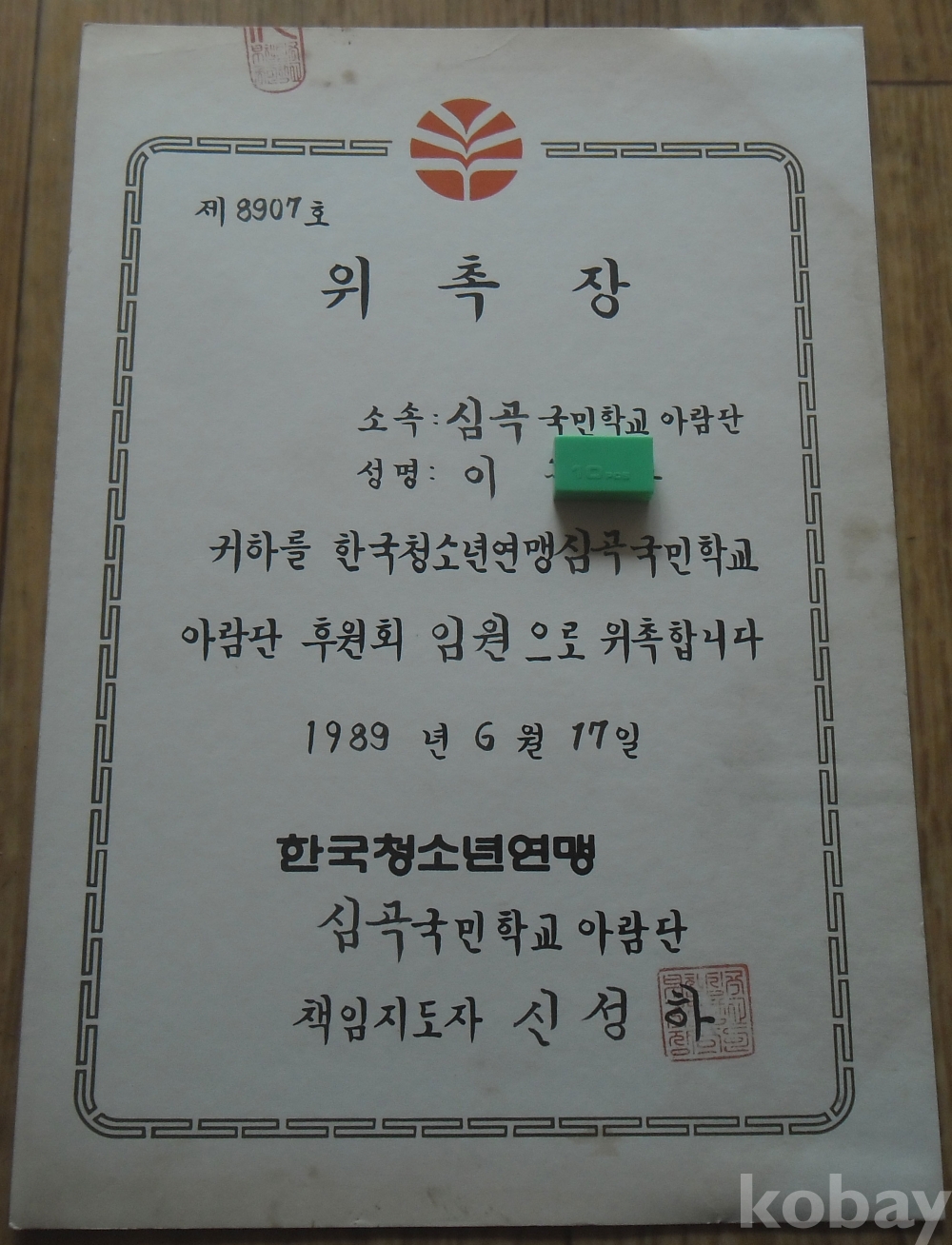 1989년 한국청소년연맹 심곡국교아람단후원회 임원 위촉장