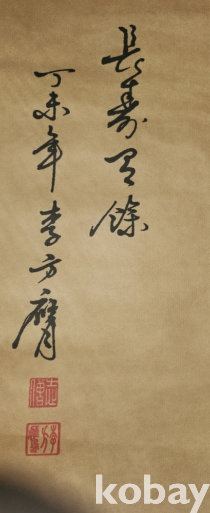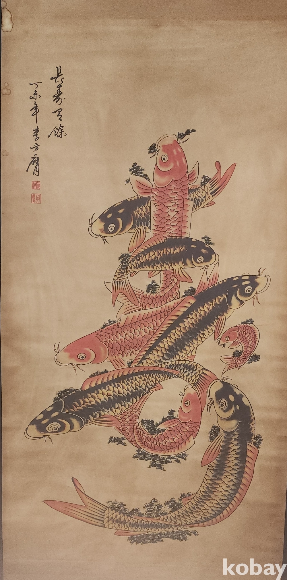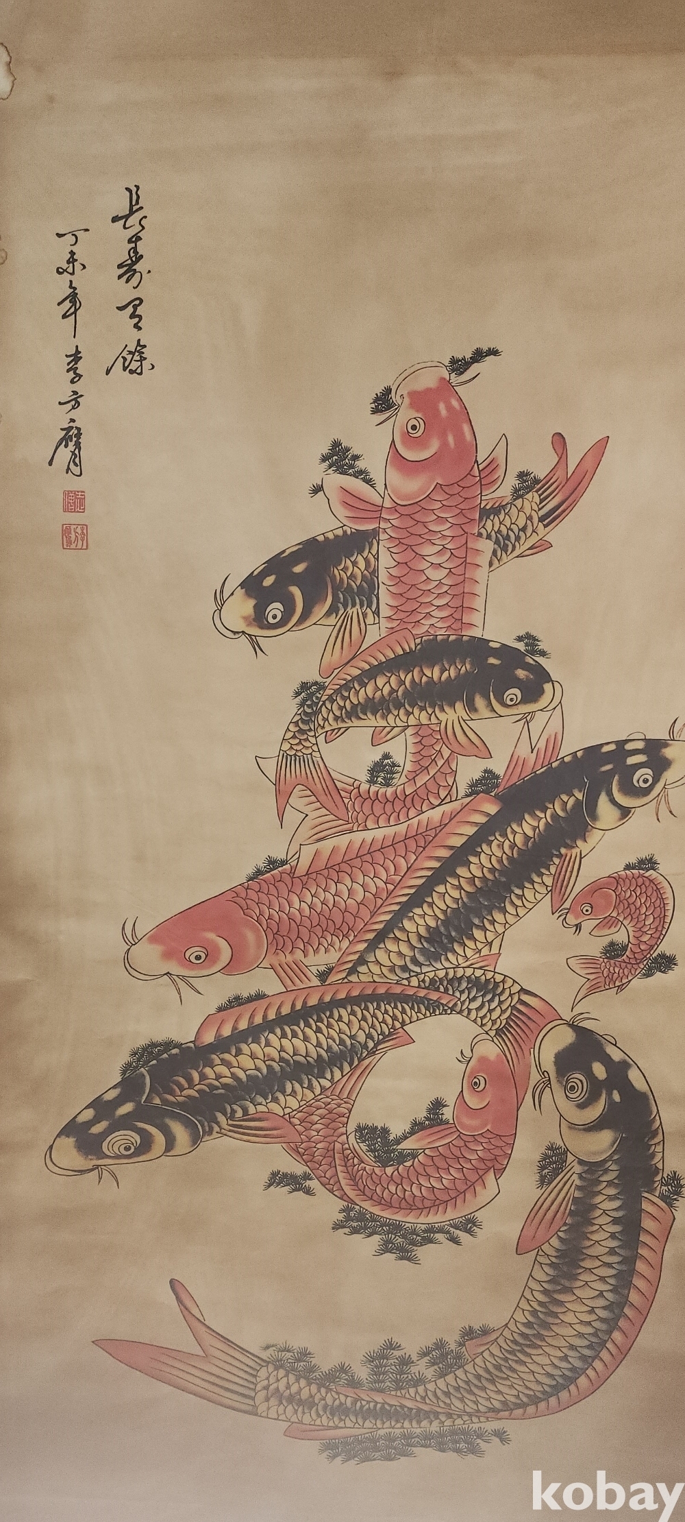 청나라 문인화가 이방응 作 비단에 채색한 비단 잉어로 수(壽) 문자도 족자입니다,