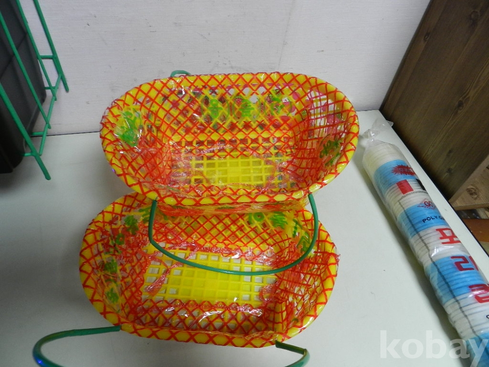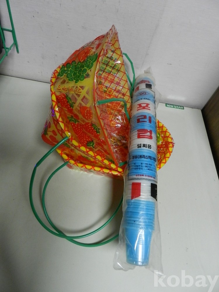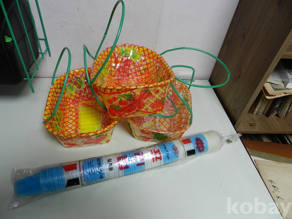 옛날 구멍가게에서 선물용 과일을 담던 바구니 3개 와 종이컵 나오기전에 사용하던 푸라스틱 재질의 소잔 잔 100개 한줄 입니다 모두 미사용으로 오래전 없어진 구멍가게에서 나온 물품들 입니다 추억 전시품으로 좋다고 합니다 이미지 참고 바랍니다