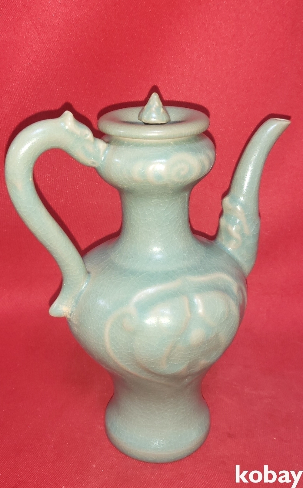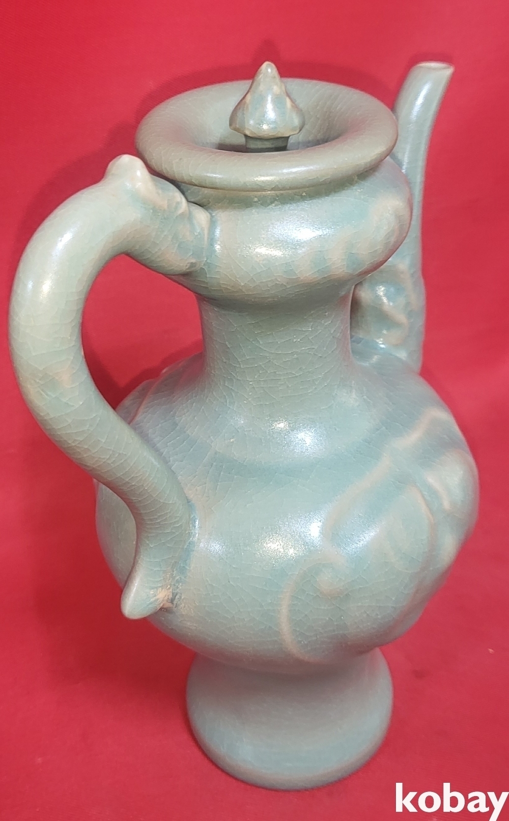 비색을 보이는 청자 용과 쌍어문(雙魚紋) 주전자입니다.
