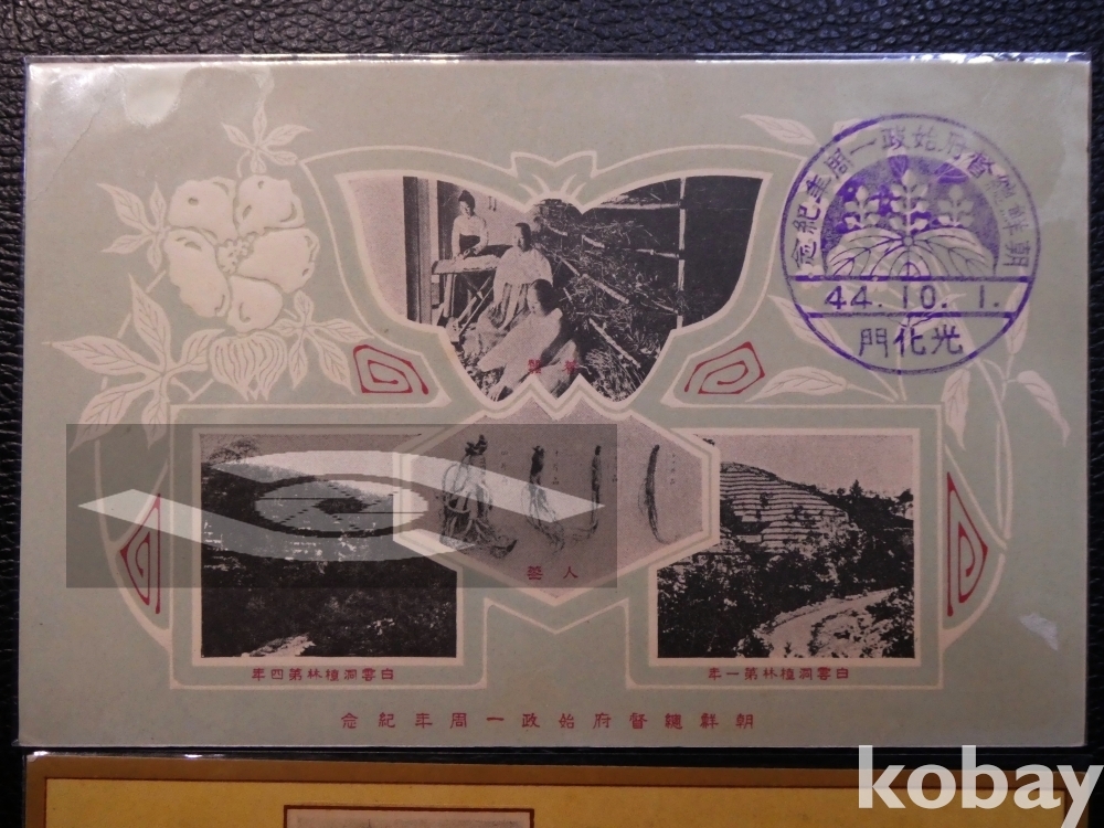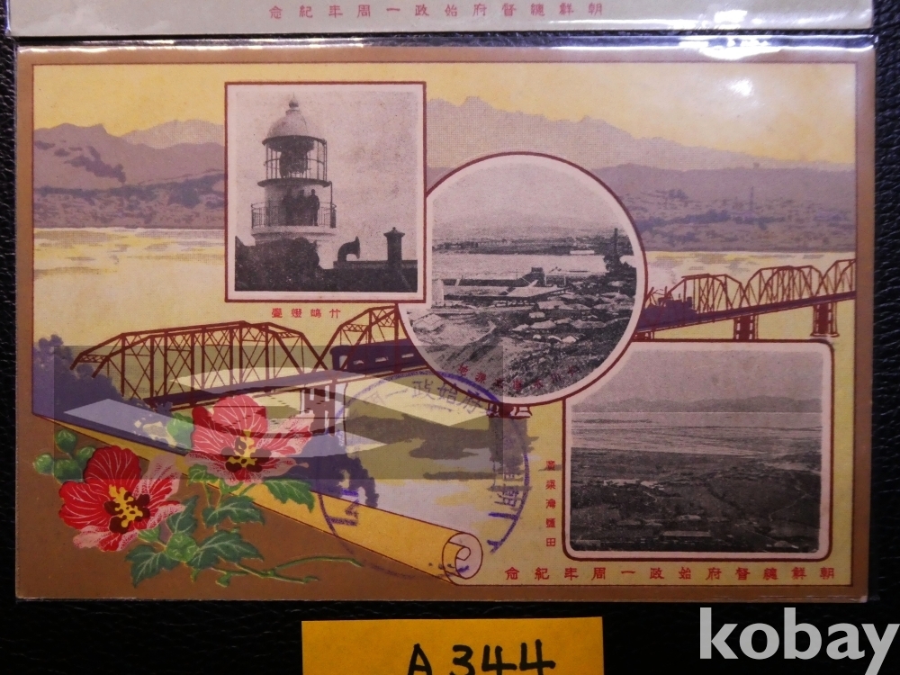 ▣설명: 전체 30여 매 시리즈. 조선총독부는 1910년 이래 매년 10월 1일이면 이른바 시정기념엽서(始政記念葉書, 1920년부터는 5주년 단위)를 발행했다. 조선총독부가 출범하여 식민지 조선에 대한 통치를 처음 펼친 날이 바로 10월 1일이었으므로 이를 기념하려는 목적이었다. 화려한 색채와 다양한 디자인이 어우러진 이 고급 엽서들은 조선의 문화 유산이나 자연풍광을 비롯해 조선 각 지방의 산업 발달 또는 중요한 역사적 사건 등을 디자인 소재로 삼았다. ‘시정기념’이란 말에 걸맞게 이 엽서들은 식민지 지배의 정당화를 넘어 총독부의 선정(善政)에 의해 미개한 조선이 비약적으로 문명개화했다고 내외에 선전하는 홍보수단 노릇을 톡톡히 했다. 실제 매년 발행된 기념엽서는 대부분 조선 전 분야가 일제에 의해 비약적으로 발달한 것처럼 묘사 하거나, 낙후된 과거 모습과 일제에 의해 ‘근대화된’ 모습의 사진을 나란히 배열하여 한눈에 비교하기 쉽게 디자인되었다. 일제의 대한제국 병탄을 한국인들이 기뻐하고 환영한 것처럼 디자인한 후안무치한 엽서들도 있다. 의도적인 상징 조작과 합성을 통해 그들은 조선인의 실상과 관련이 없는 허구의 ‘낙토(樂土) 식민지’를 이미지로 창출한 것이다.