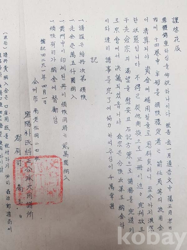 1958년 전주시 남노송동 밀양박시규정공파대동보소 자료