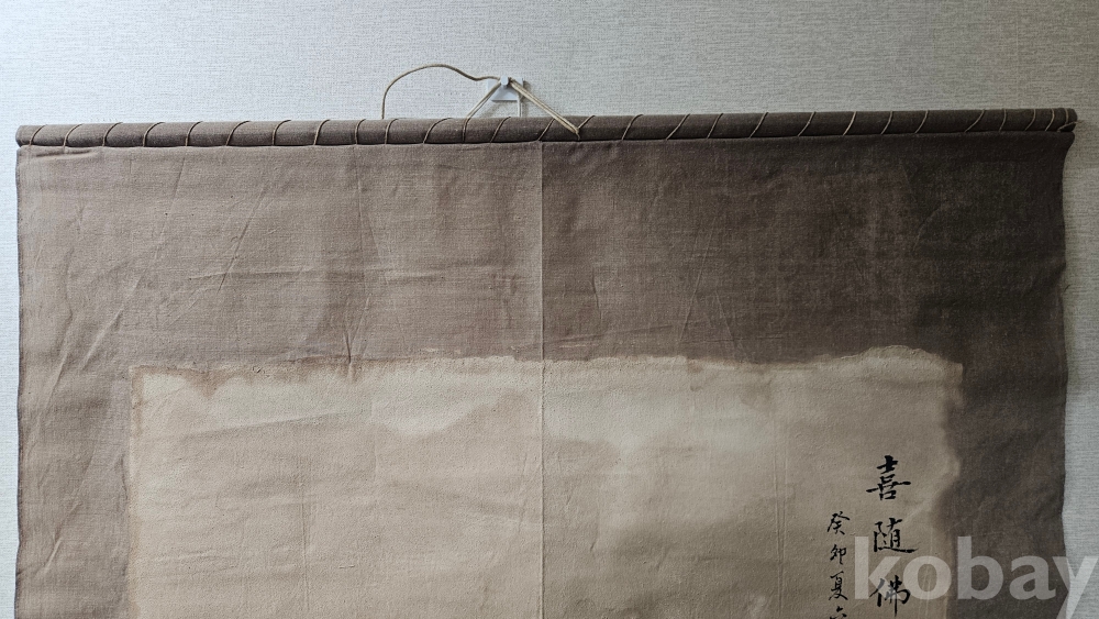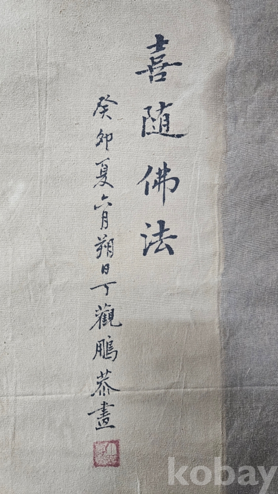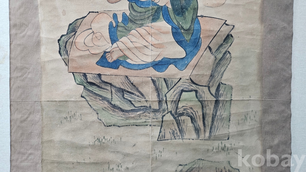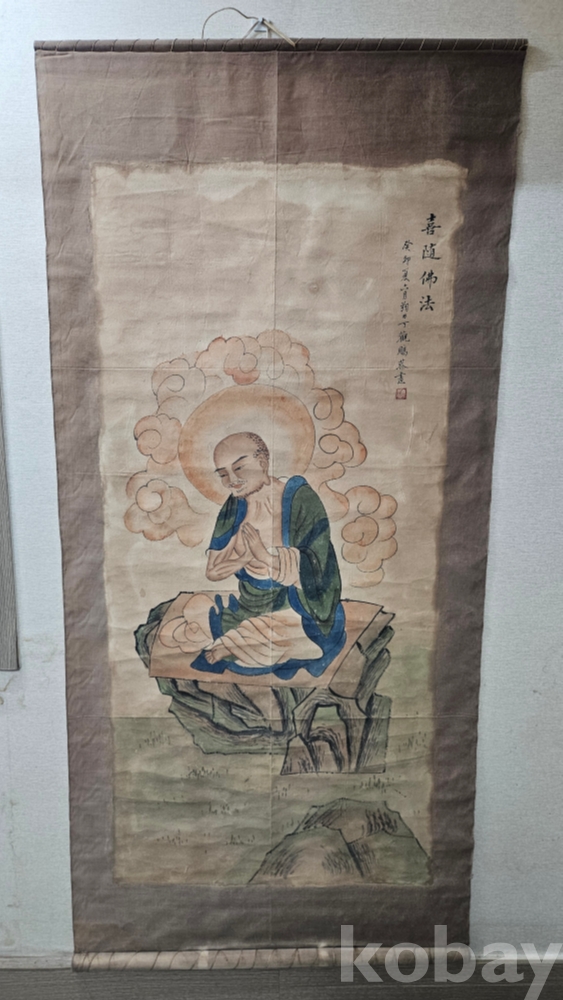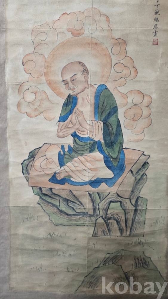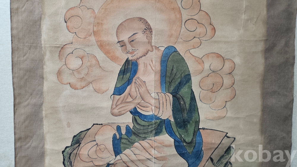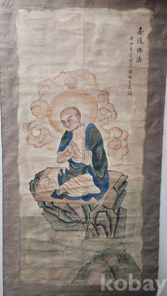 조금 빳빳한 재질의 천에 그려진 큼직한 나한도 그림족자 입니다.