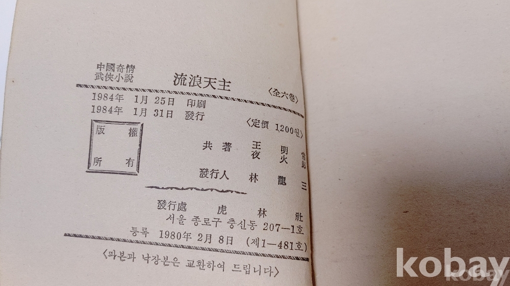 1984년 유량천주 무협지 입니다 1권 1편만 없습니다 사진참조