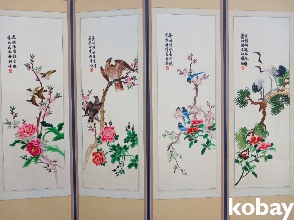 다양한 새와 꽃을 표현한 자수 8폭 병풍 입니다.