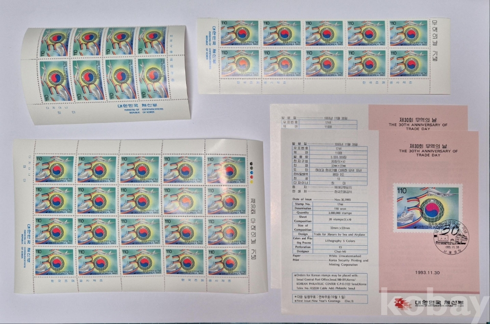 1993년 발행한 '제30회 무역의 날 기념우표' 8매 블럭 1매와 10매 블럭 1매, 안내카드 2장과 전지 1매 세트입니다.