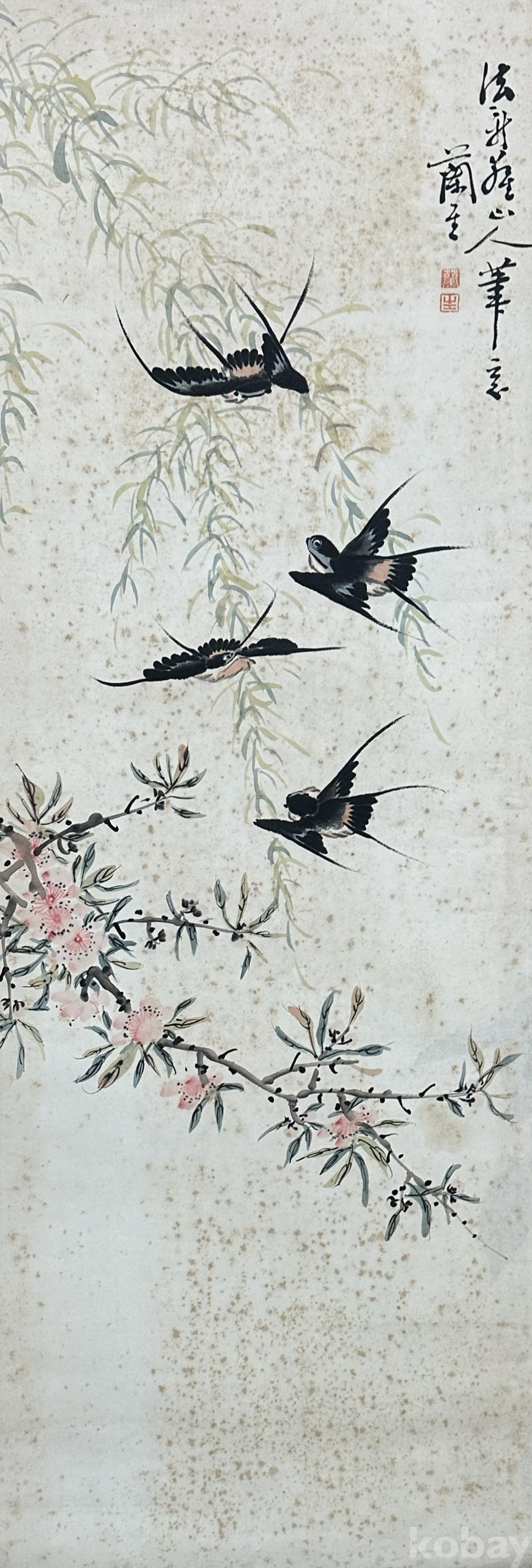 본 작품은 봄을 상징하는 제비와 매화 가지를 소재로 한 동양 화조도 채색화로, 공중을 비행하는 제비들의 역동적인 구도와 부드러운 담채 채색 기법이 조화를 이루는 작품이다. 화면 상단의 수양버들 표현과 하단의 매화 가지 배치는 공간 깊이를 형성하며, 전통 화조화 구성 원리를 현대적 색감으로 재해석한 특징을 보인다. 종이 바탕에는 자연스러운 세월감과 점상 반점 형태의 보관 흔적이 존재하나 전체 감상과 이미지 인식에는 큰 영향을 주지 않으며, 족자 제작 또는 인테리어 장식용 회화로 활용도가 높다. 중형 세로 규격으로 전시 효과가 우수한 작품이다.