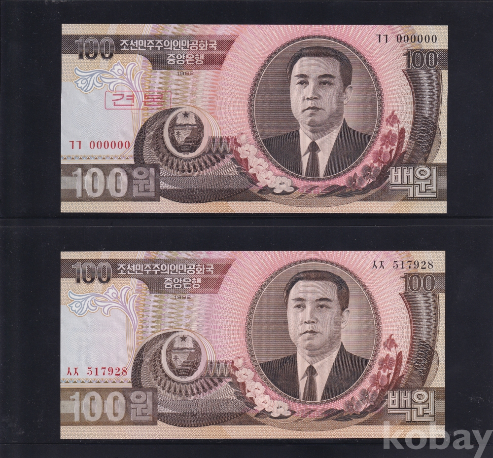 - 윗동네 1992년 백원 000 견본 / 백원 통용권 미사용 지폐 - 2장 일괄