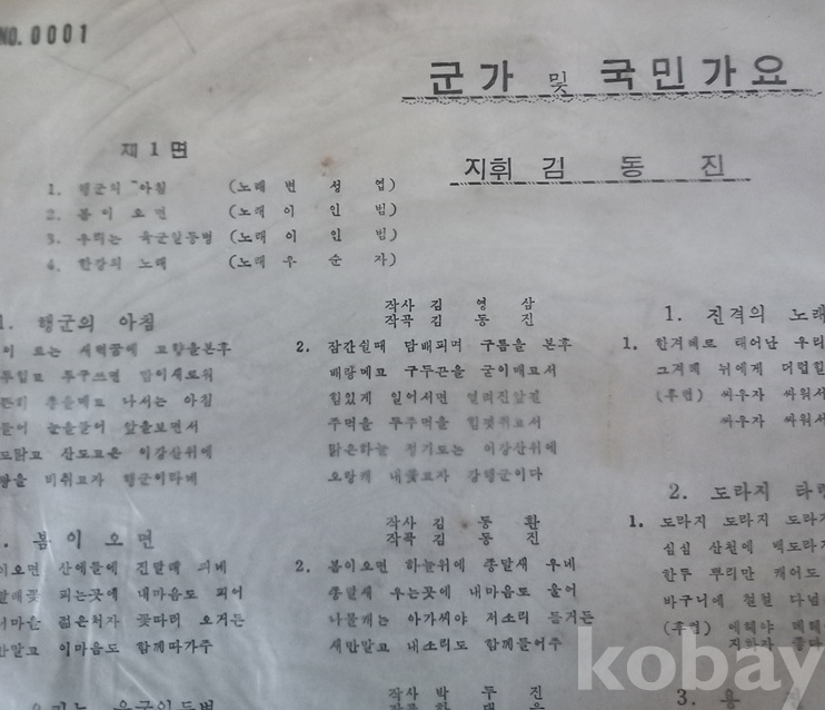 난 이 음반, 정말 오랜만에 만났지요. 정말 귀한 군가반이고. 20여년 동안 인터넷 경매시장에서 어렵게 한두번 본게 다인데.. 그때마다 가격이 높아 구경만 했을뿐이지요. 이와 비슷하게는 또 ”포병의 노래“라는 음반도 그렇고. 하여튼 이 두반은 언젠가는 한번 가질때가 있을거라 믿고 있었는데 그 기원이 하늘에 닿았는가? 오늘 군가 및 국민가요반이 아주 한 장도 아닌 두장이 한꺼번에 나왔네요. 두장 다에 욕심을 부렸지만.. 기실은 한 장만이라고 갖게 해달라고 마음속으로 빌었지요. 이게 처음엔 같은반인줄 알았는데 자세히 보니 쟈켓의 디자인이 같아서 그렇지 서로 다른반이였고. 일련번호가 넘버 0001과 0003이고. 그러니까 최소한 0002가 또 있었다는 얘기지요, 그러고 보면 최소한 3장이고.. 그 이상이 될수도 있는거지요. 이게 시리즈로 나왔는지 아니면 석장이 한번에 나온건지는 알지를 못하네요. 군가반들 중에서 이 음반이 특별해 하는건 하도 오래전에 나온반으로 아마도 그 첫 번째를 다투지 않았을까? 거기다가 시장에서는 아주 구경도 못할 정도로 귀해서이지요. 그러이 나같이 군가반수집 메니아들은 봤다면 흥분 안할 수가 없지요. 때문에 낙찰과정이 아주 치열했었고. 결국 나도 한 장은 놓치고 말았고.. 나머지 두장은 내 생애에 구할수 있을라는지? 구할수만 있다면 또 얼마나 좋을까? 판매자 얘기로는 1959년도 판이라 하였지요. 그러이 당연히 스테레오도 아닌 롱 플레이고. 그 나머지중 2번과 4번, 두장을 오늘23.4.14 구입을 했네. 비싼값에도 전혀 기분나쁘지 않았고.. 이젠 남은건 0001번 한 장인데 이건 또 언제 손에 넣을라는지?