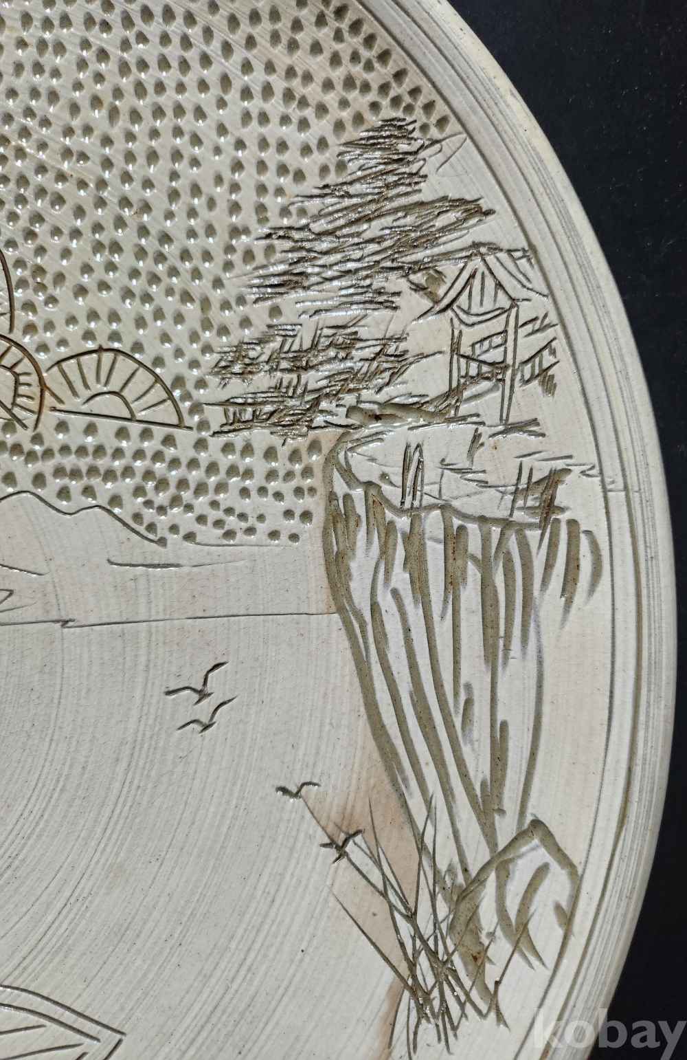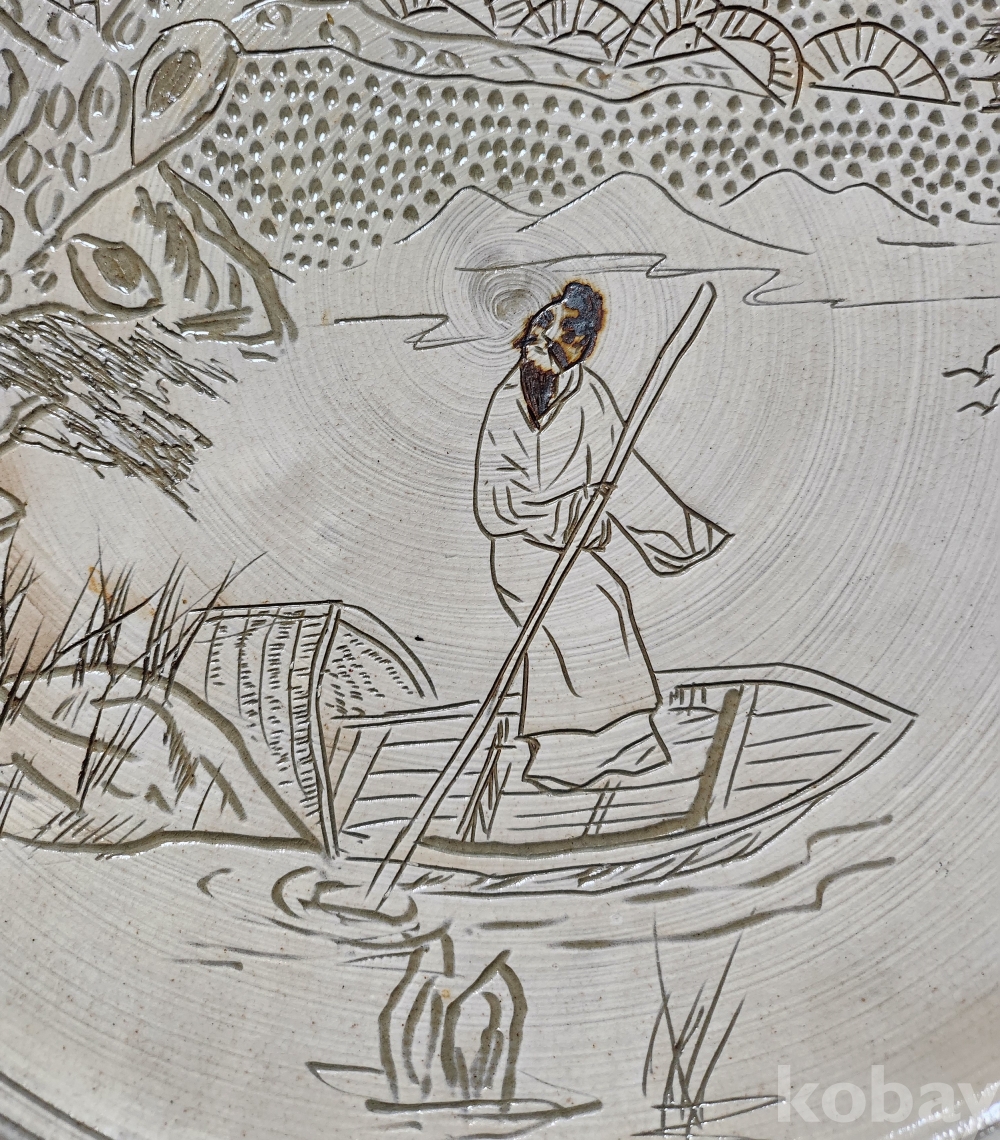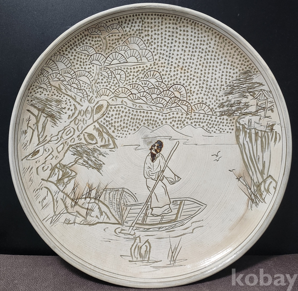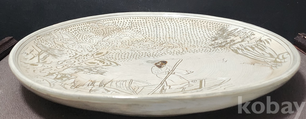 청담[淸淡] 한창문[韓昌文] 초기작[初期作] 분청음각강상어락도문접시 粉靑陰刻江上魚樂圖紋楪匙