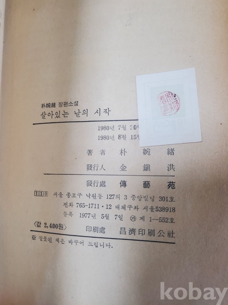 1. 살아있는 날의 시작, 박완서, 전예원, 1980년, 388쪽, 상태 상, 사진 참조