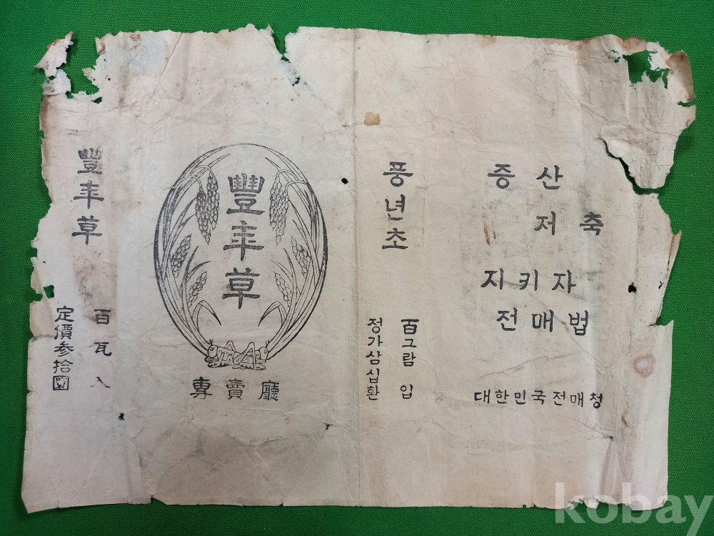과거 대한민국 전매청에서 생산하고 판매했던 대표적인 봉초(잎담배를 썬 것) 담배인 풍년초의 포갑지(포장지)입니다.