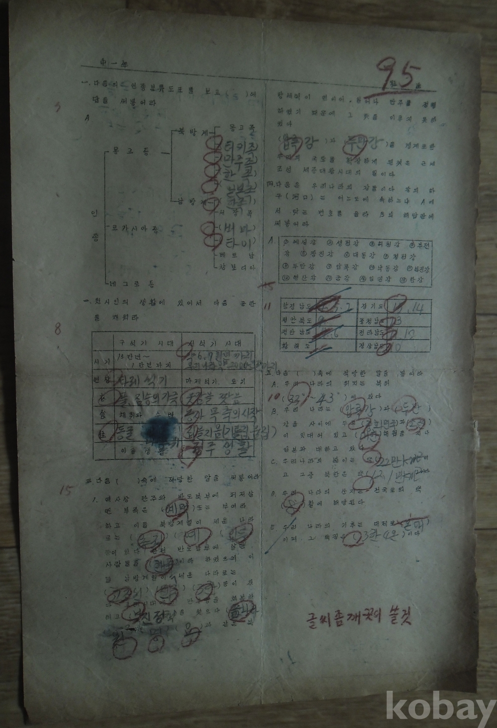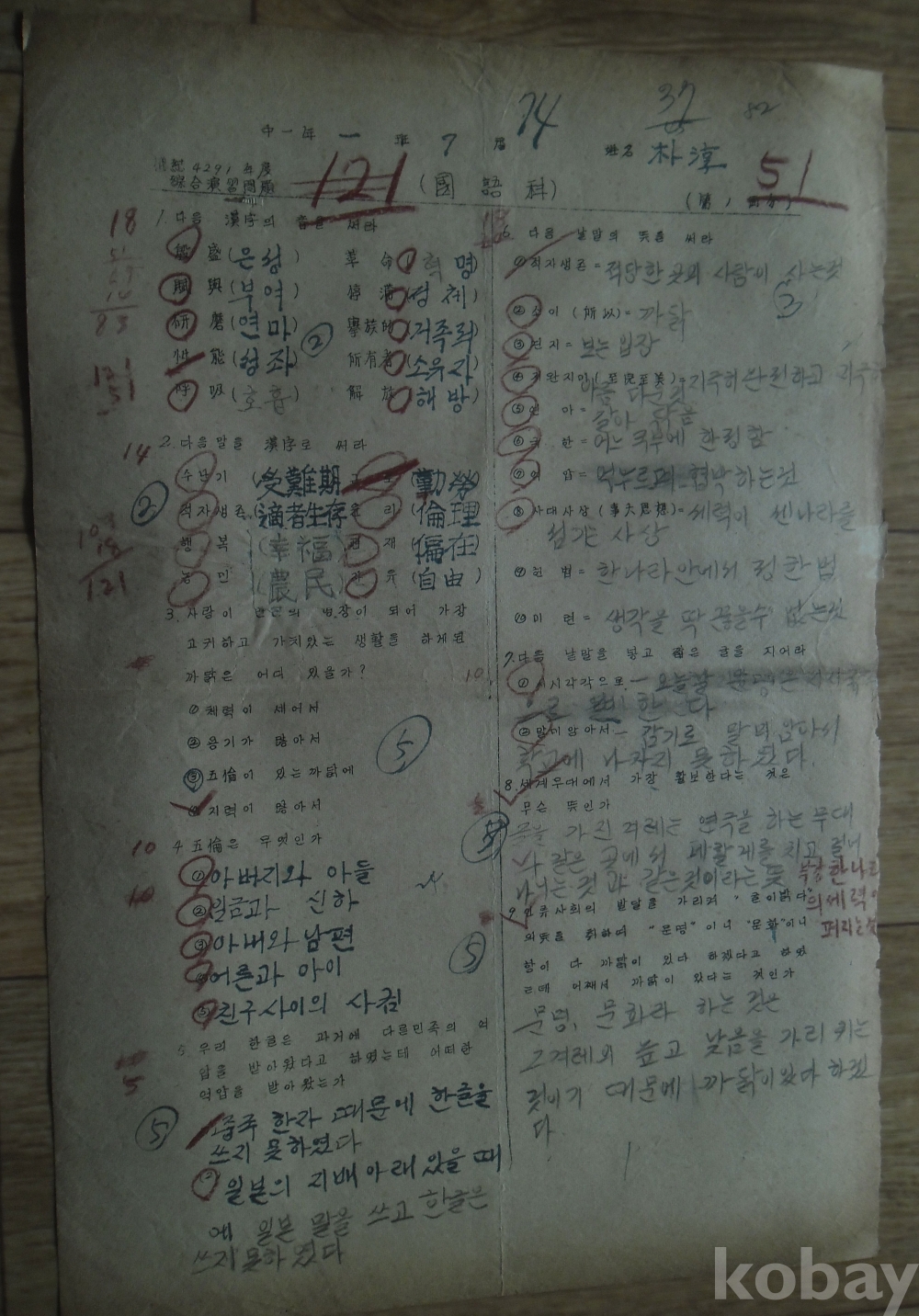 1958년 중학교 1학년 시험지 국어/사생