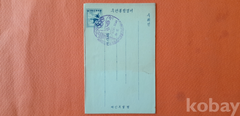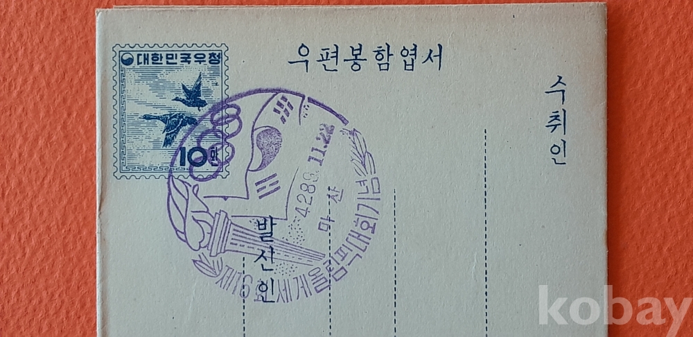 1953년 10환 기러기 봉함엽서에 '제16회 세계올림픽대회 마산인' 엽서 입니다.
