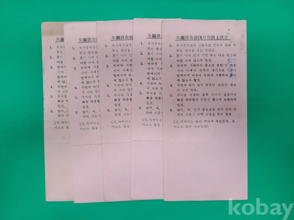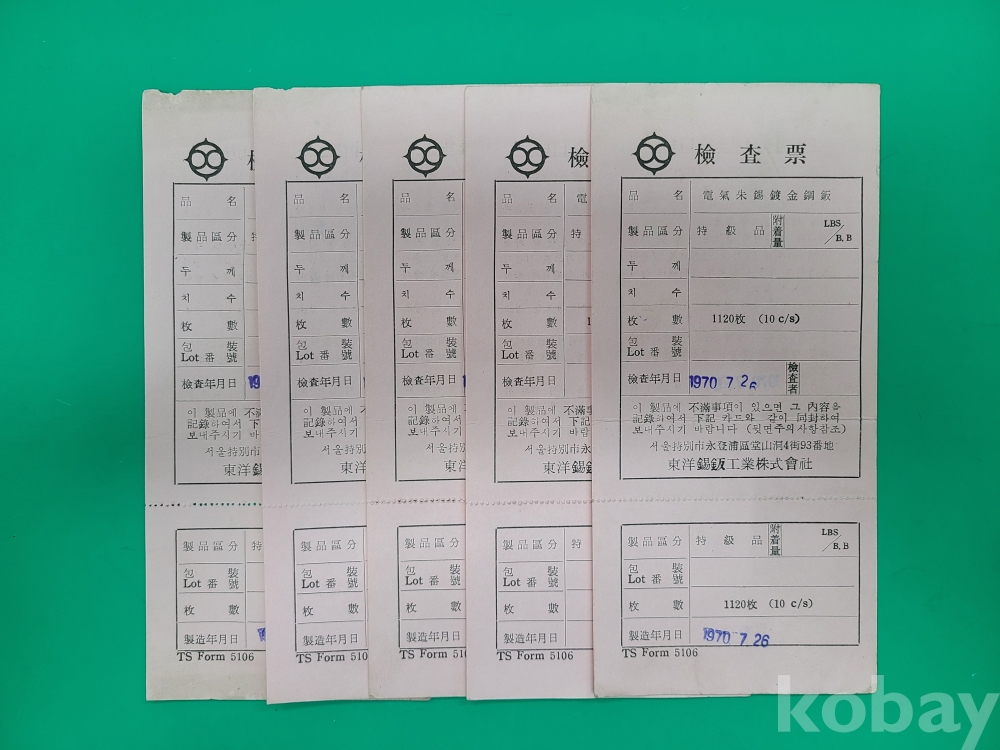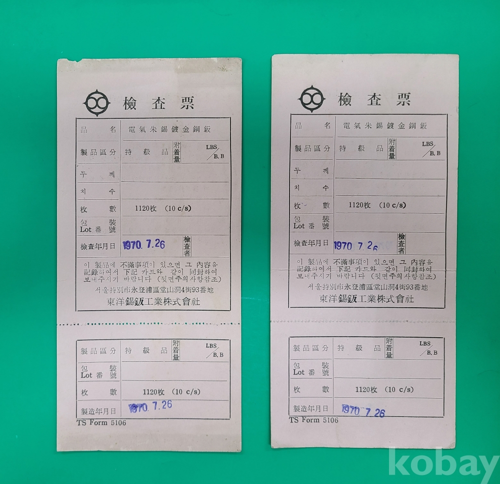 ▶1970년 동양석판공업주식회사 전기주석도금강판 검사표 5부