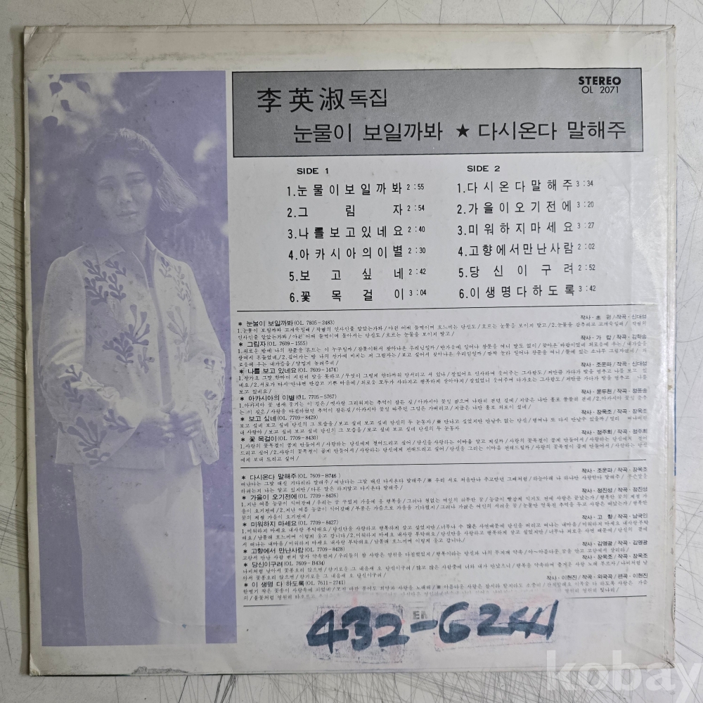 | 자켓상태 | VG : 주름, 접힘, 모서리 찢김 다수 | 음반상태 | VG : 생활 기스 다수, 가벼운 노이즈 존재 | 발매정보 | 초반 | 가사지여부 | 무 |