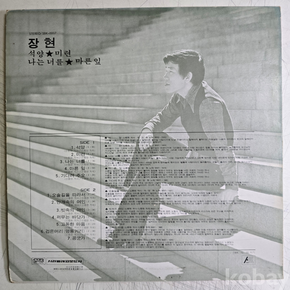 | 자켓상태 | VG : 주름, 접힘, 모서리 찢김 다수 | 음반상태 | VG : 생활 기스 다수, 가벼운 노이즈 존재 | 발매정보 | 초반 | 가사지여부 | 무 |