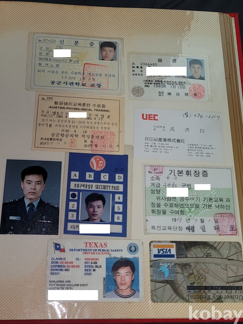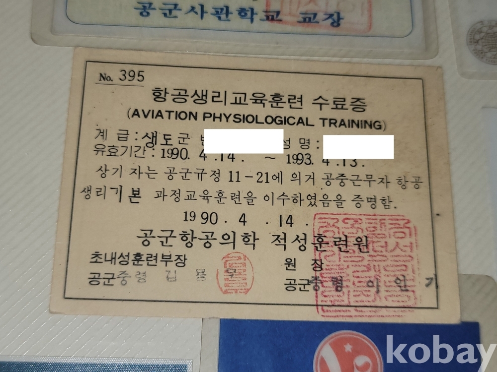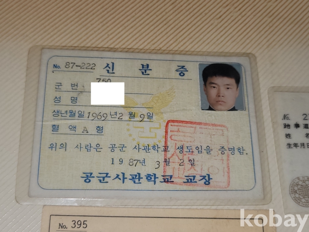 각종 수료증, 학생증, 휘장증 등 여러 카드 자료와 사관학교 체육대회나 공군사관학교 생활 사진이 포함되어 있습니다.