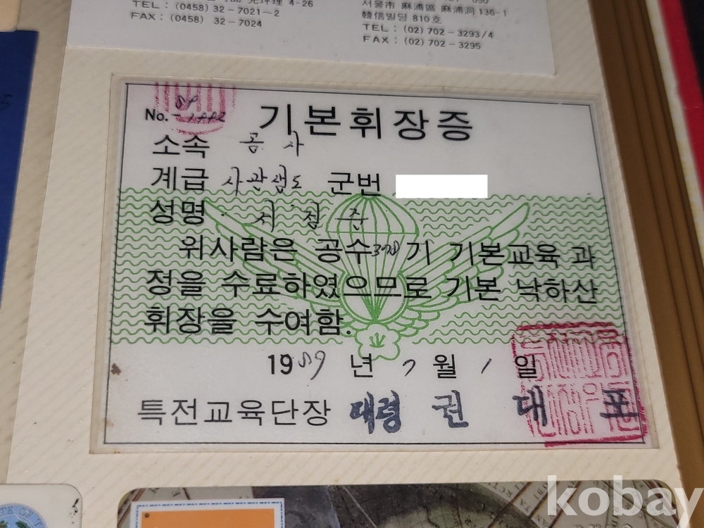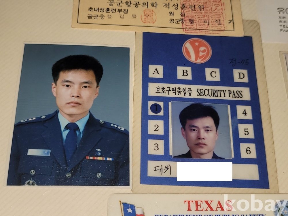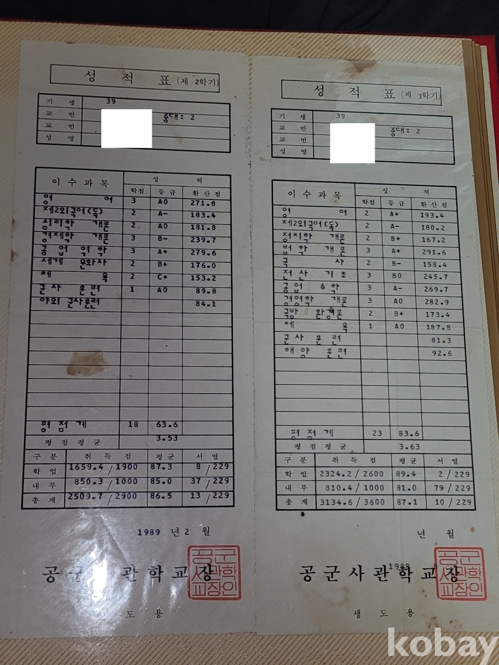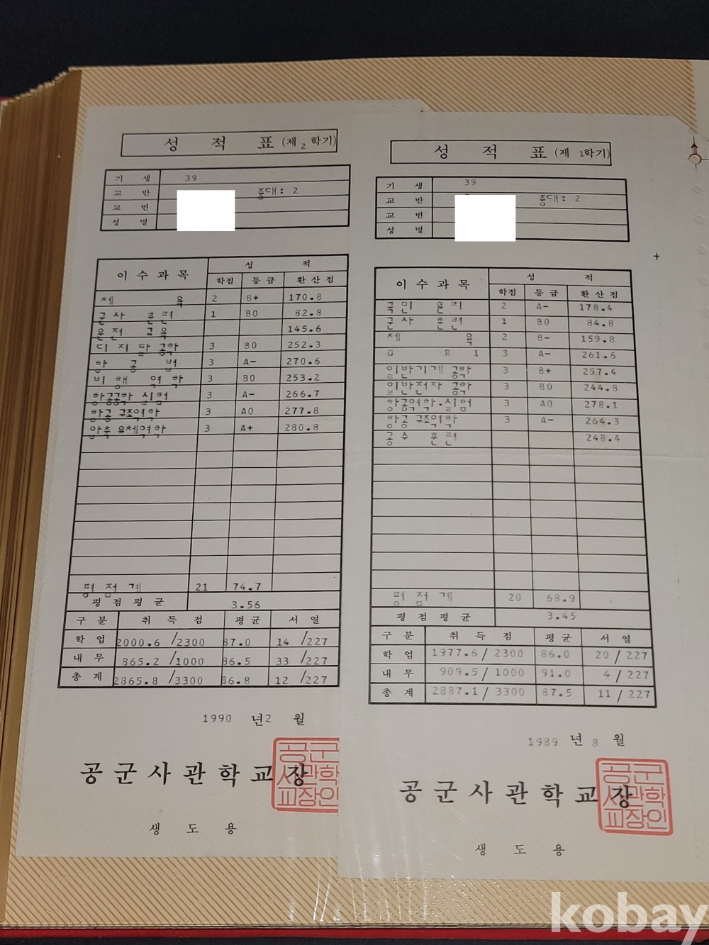 각종 수료증, 학생증, 휘장증 등 여러 카드 자료와 사관학교 체육대회나 공군사관학교 생활 사진이 포함되어 있습니다.