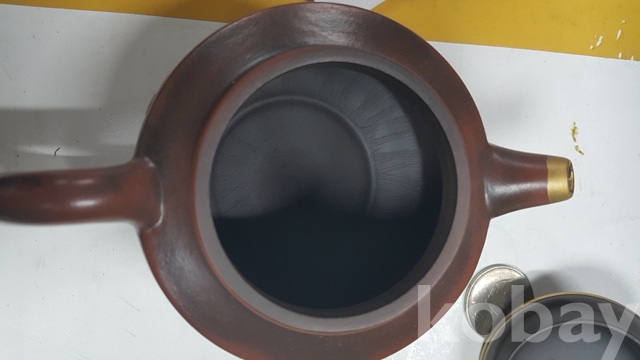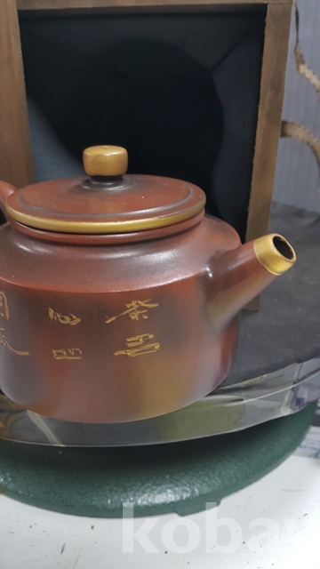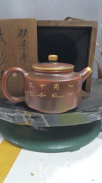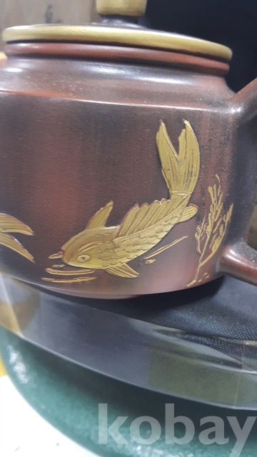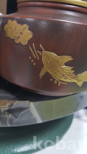 c-138,오동나무박스에든 중국1일자고경주의금칠된물고기문양자사찻주전자(미감정)