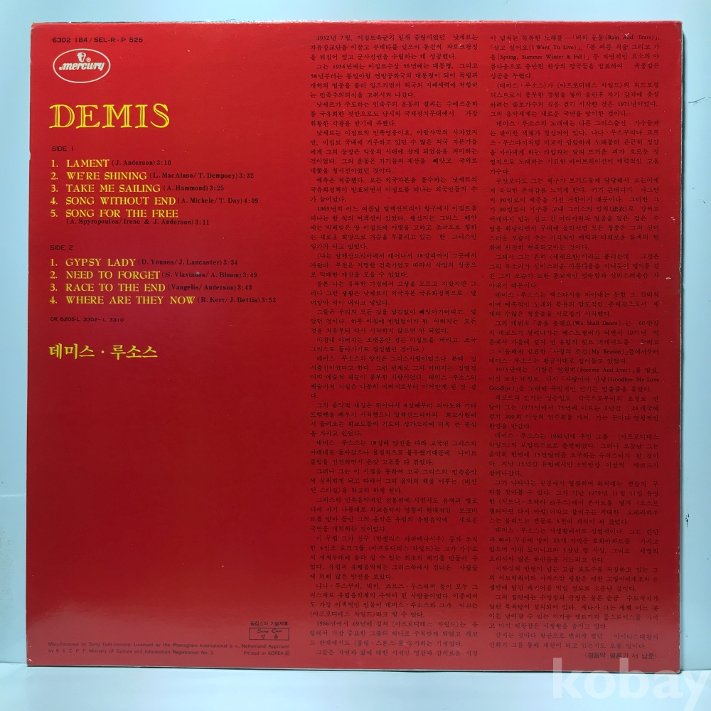 LP LP 1-21-2 Demis Roussos - Demis . 자켓 EX+ 알판 EX 82 년 국내반