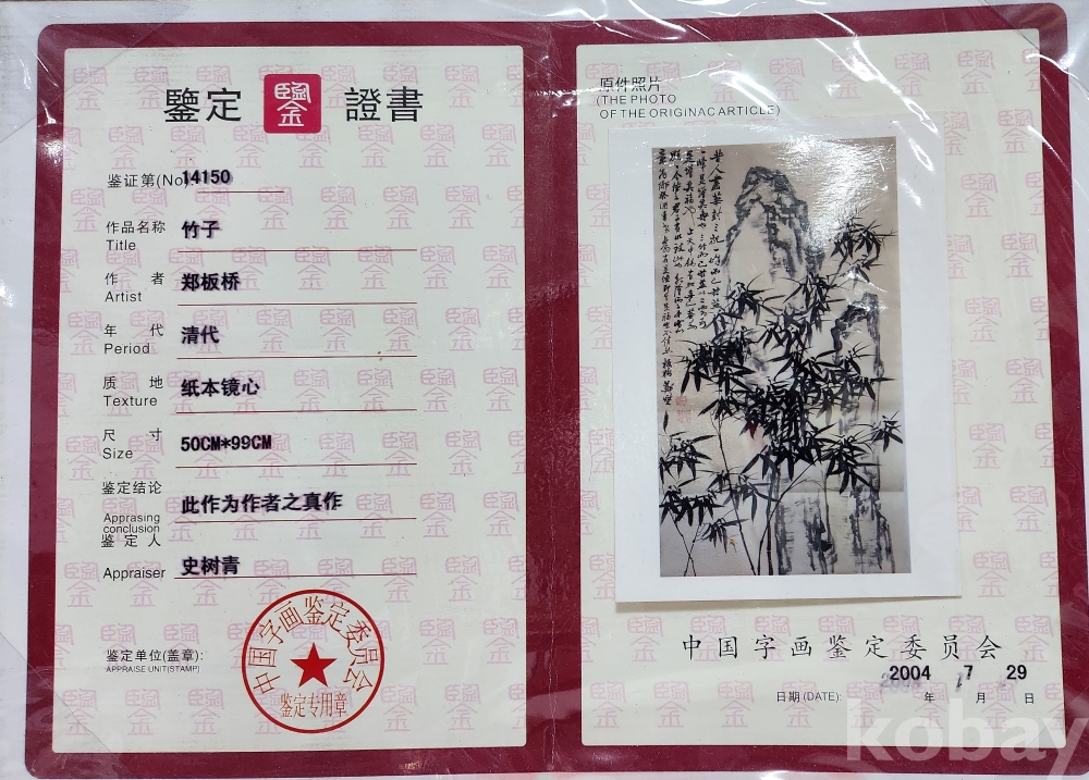 감정서(鑑定證書)가 함께하는 중국화가 정판교(鄭板橋)대나무 그림(竹畵)입니다,
