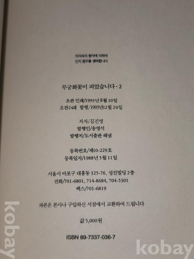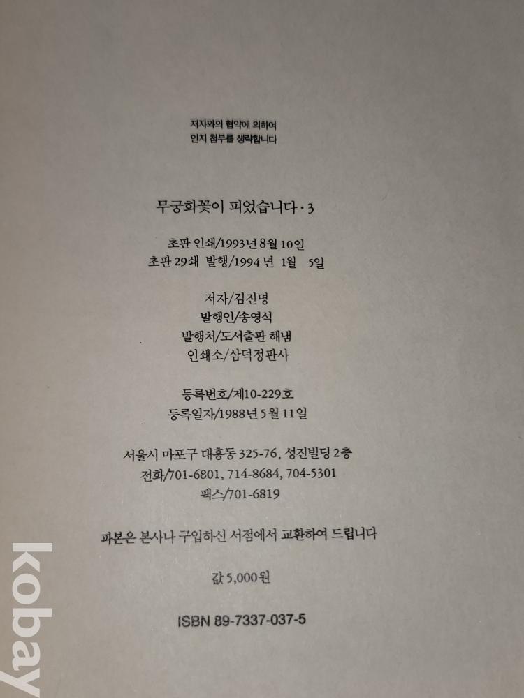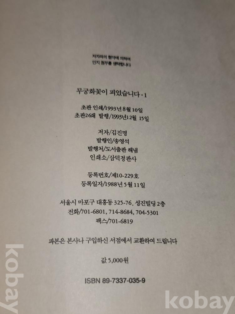 빈티지 1993년 발행 김진명 소설 무궁화 꽃이 피었습니다 소설책 1~3권 일괄입니다.