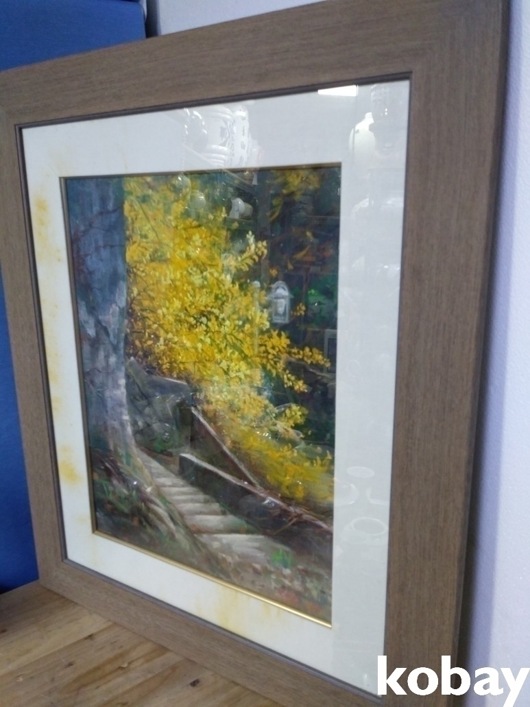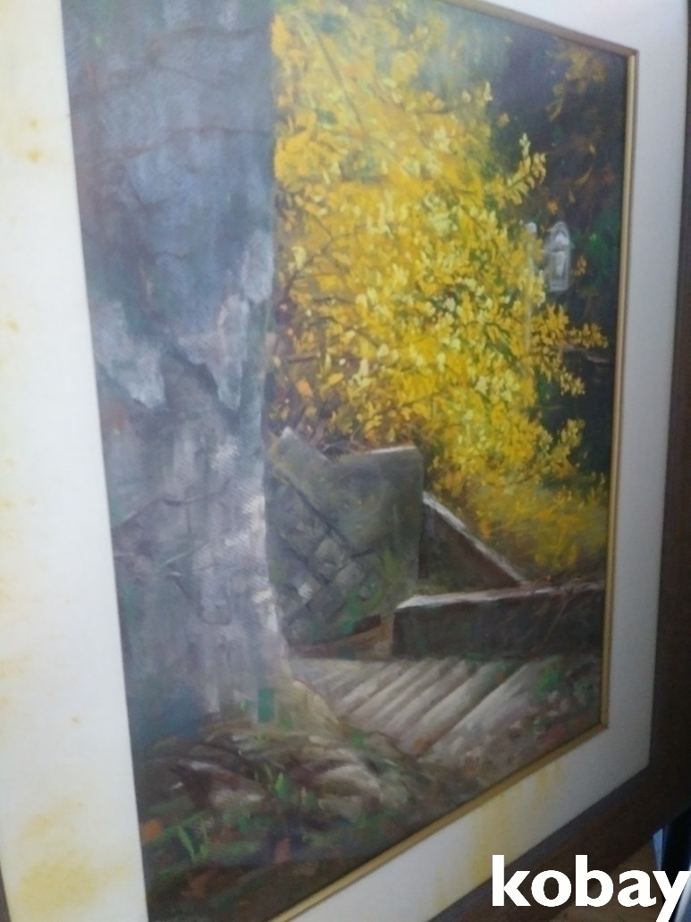 개나리꽃이 만개한 계단 골목길을 표현한 유화 액자 입니다.