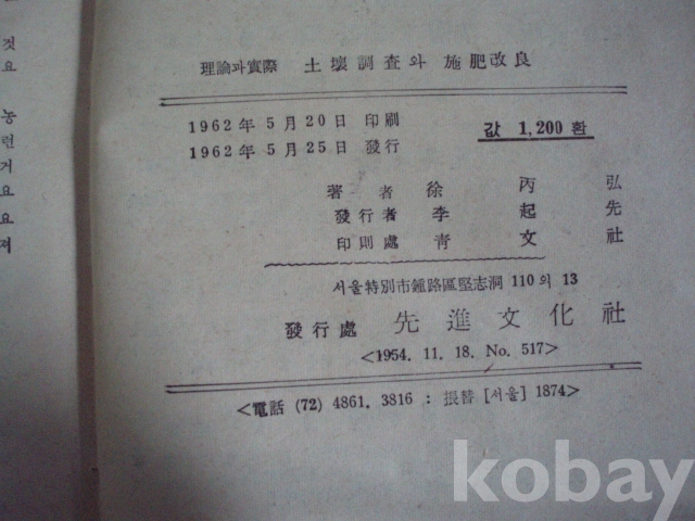 (이론과 실제 ) 토양조사와 시비 개량 (1962년, 고대 농과대 서병홍 편저, 선진문화사)