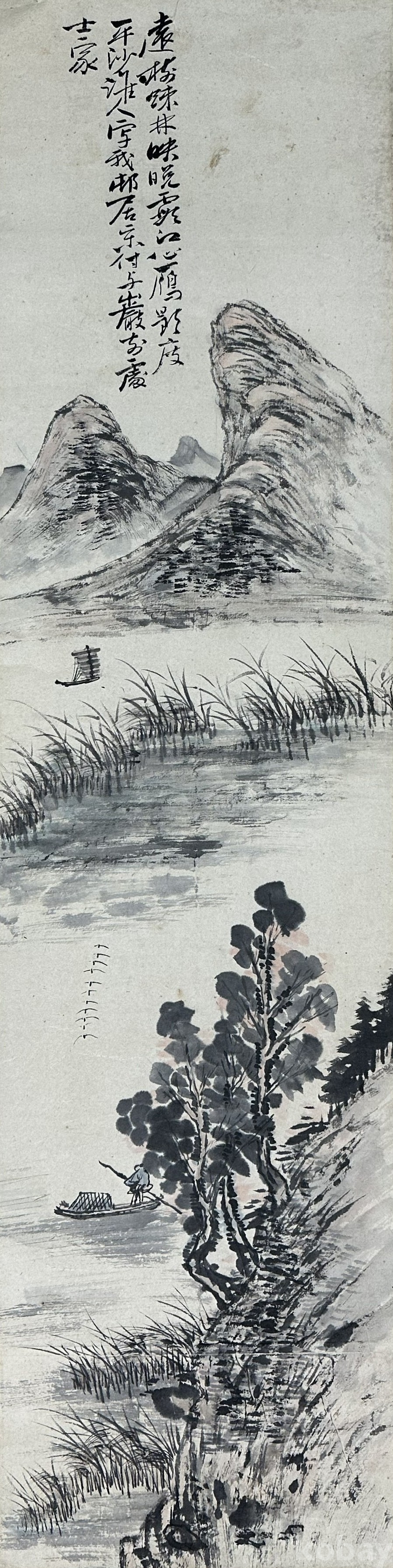 산과 강, 배와 인물을 함께 배치한 전통 동양화 산수 풍경 구성의 세로형 작품이다. 원근감을 살린 산세 표현과 부드러운 먹의 번짐을 활용한 수면 묘사가 특징이며, 화면 하단에는 강변 풍경과 나무, 인물 요소가 어우러져 서정적인 분위기를 형성한다. 종이에 직접 제작된 원화 형태로 수묵화 특유의 담백한 화면 구성과 장식성이 살아 있어 인테리어 연출용 또는 산수화 소품 컬렉션용으로 활용하기에 적합하다.