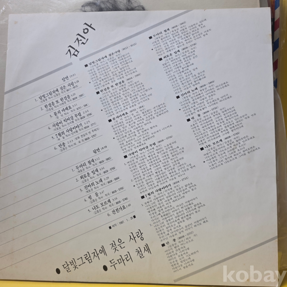 상품 설명 | Side A 1. 달빛그림자에 젖은 사랑 2. 한걸음 또 한걸음 3. 묻지 마세요 4. 사랑이 익어갈 무렵 5. 7월의 사랑이야기 6. 만종 Side B 1. 두마리 철새 2. 외로운 잎새 3. 진아의 노래 4. 빗물 5. 나도 모르게 6. 건전가요 |