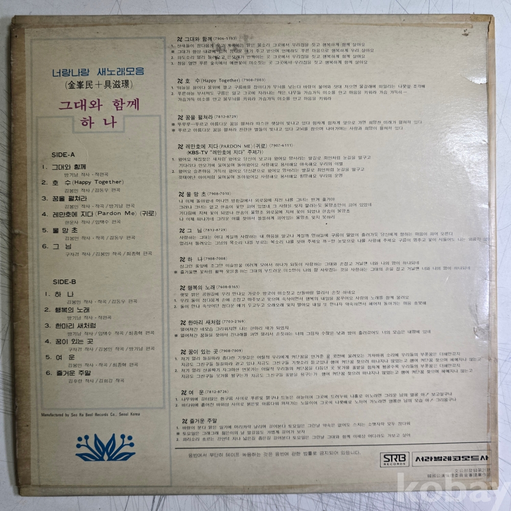 | 자켓상태 | VG : 주름, 접힘, 모서리 찢김 다수 | 음반상태 | VG : 생활 기스 다수, 가벼운 노이즈 존재 | 발매정보 | 초반 | 가사지여부 | 무 |