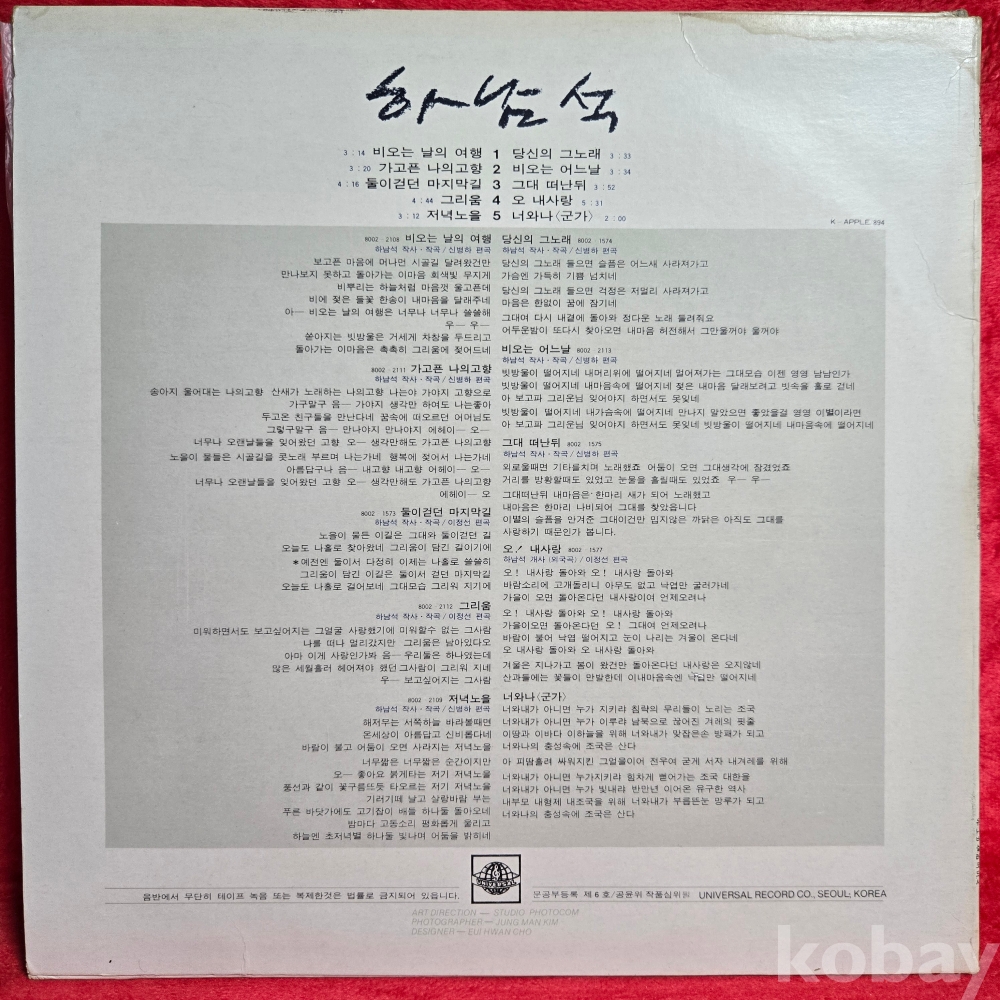 | 자켓상태 | EX : 약간의 마모, 모서리 찢김 존재 | 음반상태 | EX : 재생에 영향 없는 가벼운 기스 존재 | 발매정보 | 초반 | 가사지여부 | 무 |